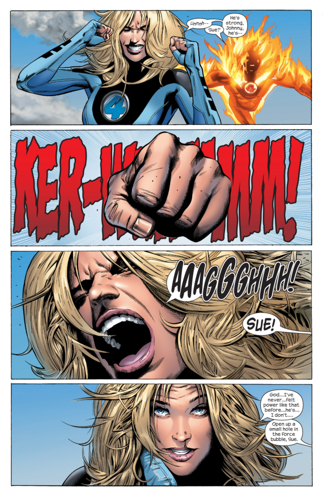 This is frankly unprofessional work. Boring, completely lacking dynamism, tons of wasted space, didn’t even bother to draw a background. After a whole nother page of this, Hyperion uses his heat vision to blow up the force bubble in a page with just 2 panels. I think JMS’s 3 issues could’ve been 1 and no one would notice.