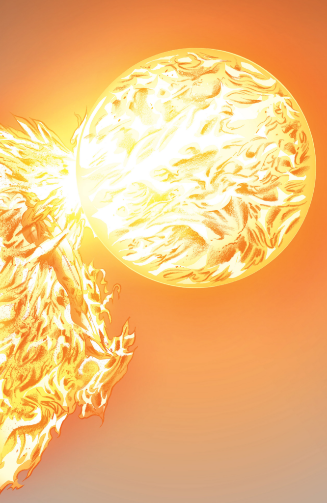 Why did Thor just quit participating? I’m assuming it’s cuz Greg Land sucks, but I don’t know. Look at the bottom panel. Ridiculous. Johnny flies by a Thor that appears frozen in time and fills Sue’s force bubble with fire, but Hyperion just keeps on punchin’. Thor finally moves to go support Sue as Johnny turns his fire up to nova. Which leads to a splash so terrible I want to show it.