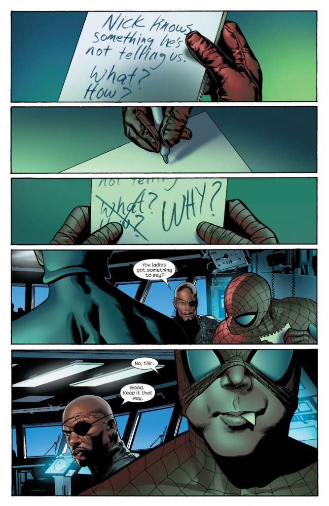 He is Superman, after all. Meanwhile, the helicarrier is headed to DC, as Fury is sure it’s where Reed is being kept. There’s a line referencing the Bush administration’s lies about weapons of mass destruction in Iraq that was already pretty dusty in 2008, and then Spider-Man writes something down and hands it to Cap. Is it the Charest drawing? You know it!