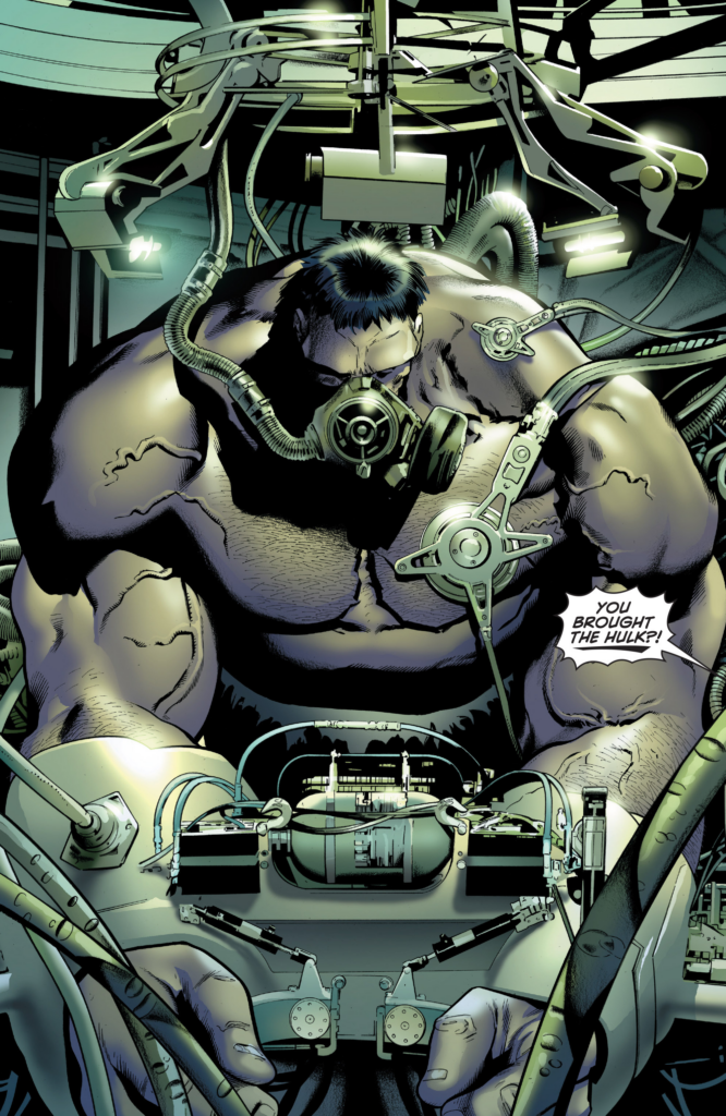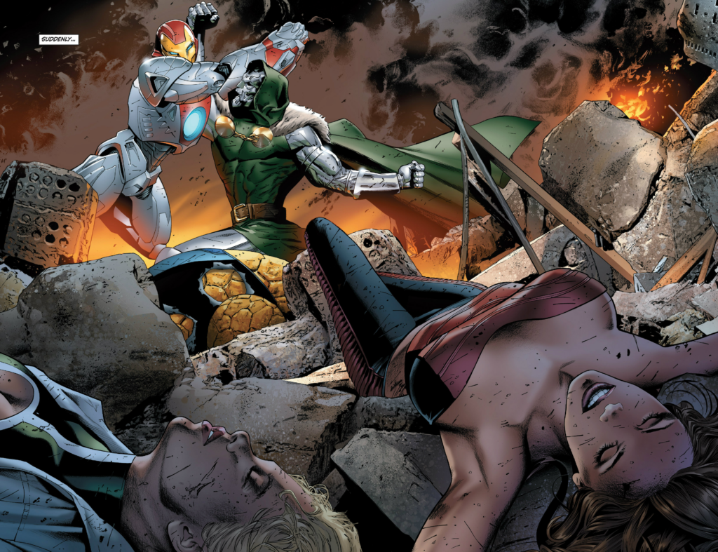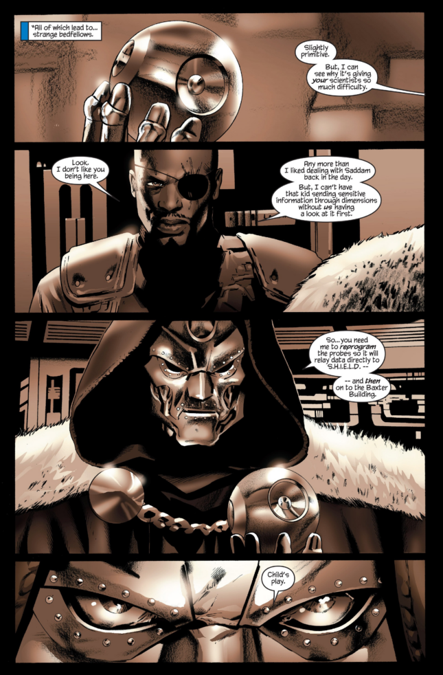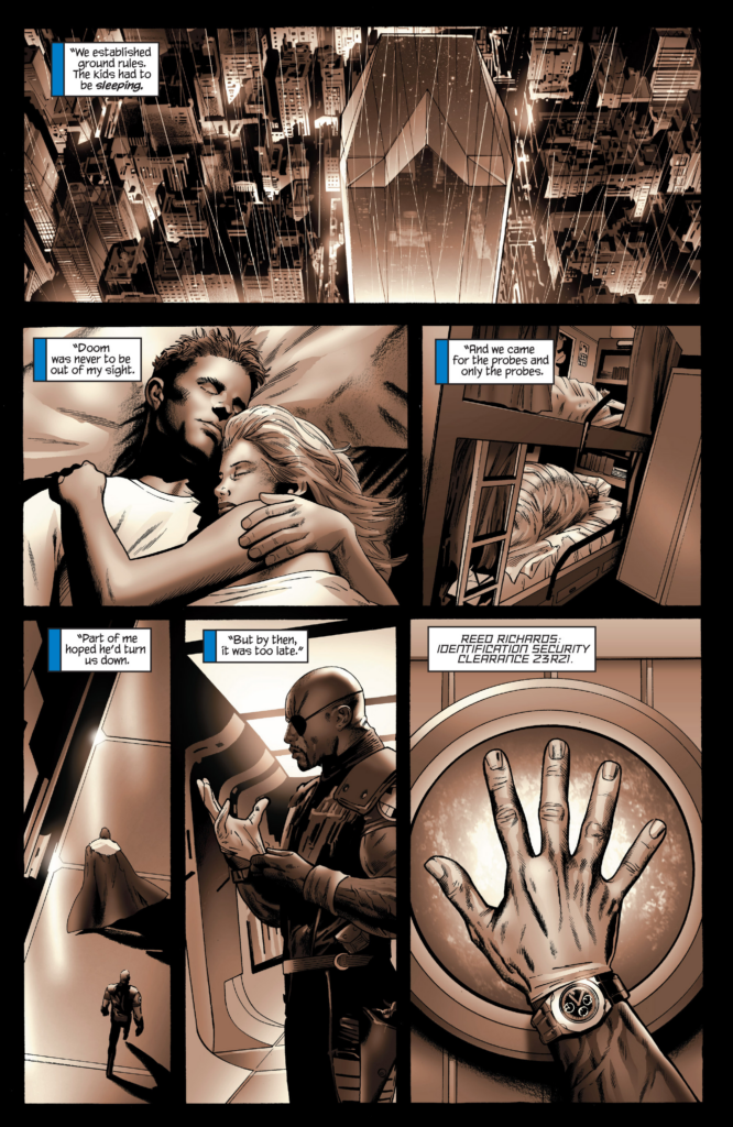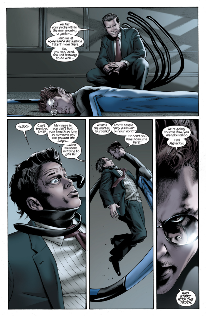 So Doom tampered with the thingies and everything else happened. How on Earth is this happening? Nick Fury may be ruthless, but Dr. Doom? The powers that be ok’d this? Good grief. Spider-Man says “We have to find Reed Richards!” like that hasn’t been the plot of most of this series, and we move our scene to Reed, unconscious, as that guy who drugged him, Emil Burbank, unreels his own origin story. I guess he’s the Lex Luthor of this piece. He goes on to detail how he created the thing ravaging the world at the behest of a US Military that wanted something to kill Hyperion, which also had recovered one of Reed’s probes. So they used it as a scapegoat. What? What did Doom do, then? This is stupid.