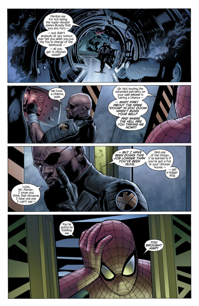 Travis Charest Spider-Man again. 2nd panel Spidey has a weirdly Dan Jurgens look. I guess Fury’s gonna spill the exposition now. Nick flashes back to how this nonsense started, with Ben receiving a grievous wound that disappeared immediately despite being the impetus for this entire series because Greg Land sucks, and to Fury rejecting Reed’s probes. And then…