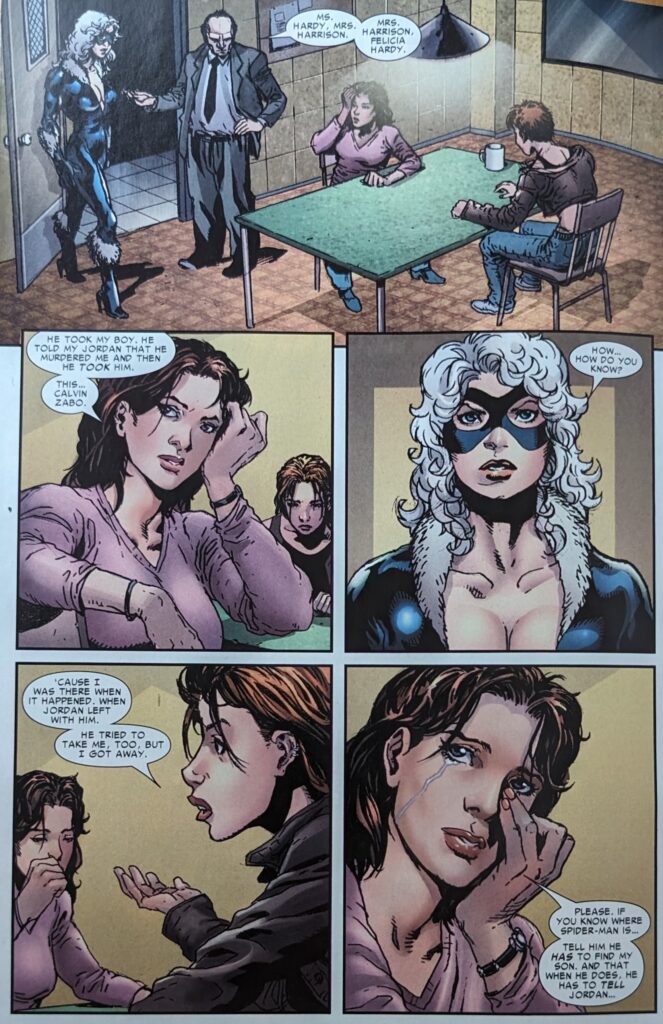 Oh, it’s the kid from SSM 28. Unbreakable glass, ok. Spider-Man should be able to go through the brick around it. Jordan names his kidnapper, and Spider-Man reacts in horror, like he hasn’t waxed that guy repeatedly over the years, and then Mr. Hyde appears to do battle. Meanwhile, Black Cat delivers another Spider-Man to Detective Fogg. Man, Peter must have her on speed dial these days.