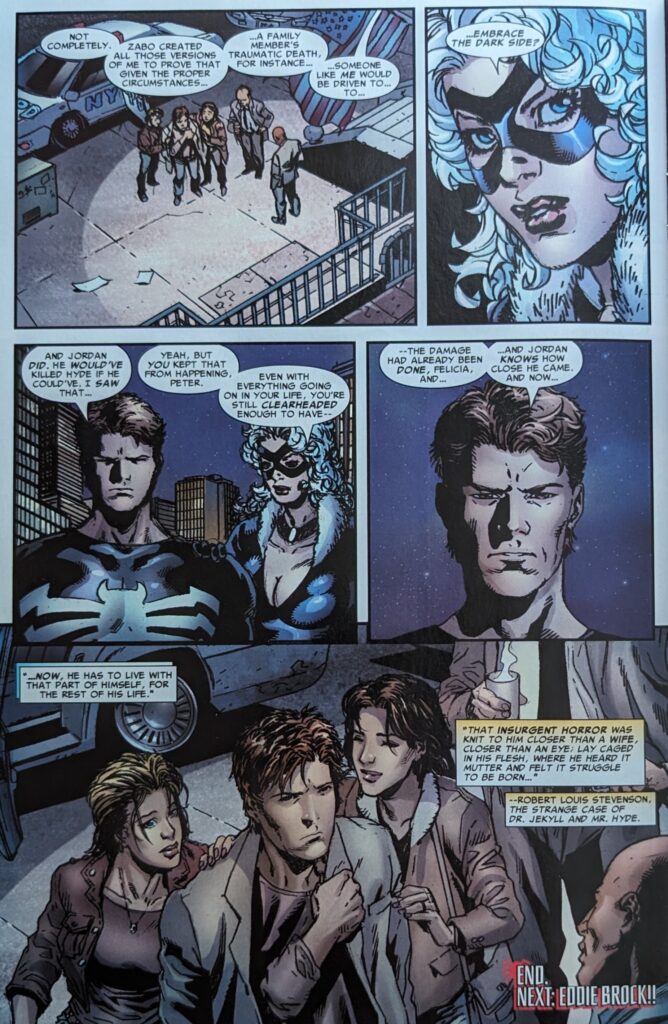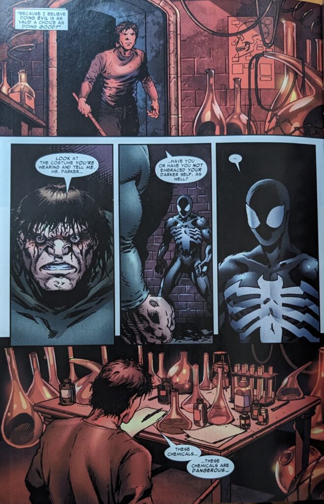 I looked ahead. Angel Medina is not coming back. He managed to draw just 8 of the 17 issues in this run. A year-ish from now, he’ll draw a Venom origin miniseries I haven’t read. Maybe he had some issues during this. At any rate, same art team as last month as we wrap this thing up. We find Zabo turning into Hyde, wondering how Robert Louis Stevenson could have known exactly what his transformation would feel like (hilarious). Meanwhile, Spider-Man is beating himself up or not being at Aunt May’s side as he finds his way to Zabo’s hideout using the tracker he made. It’s really big. Somehow. I mean it’s like a zoo, with brick walls, hidden in the sewer. Who built this? Why?