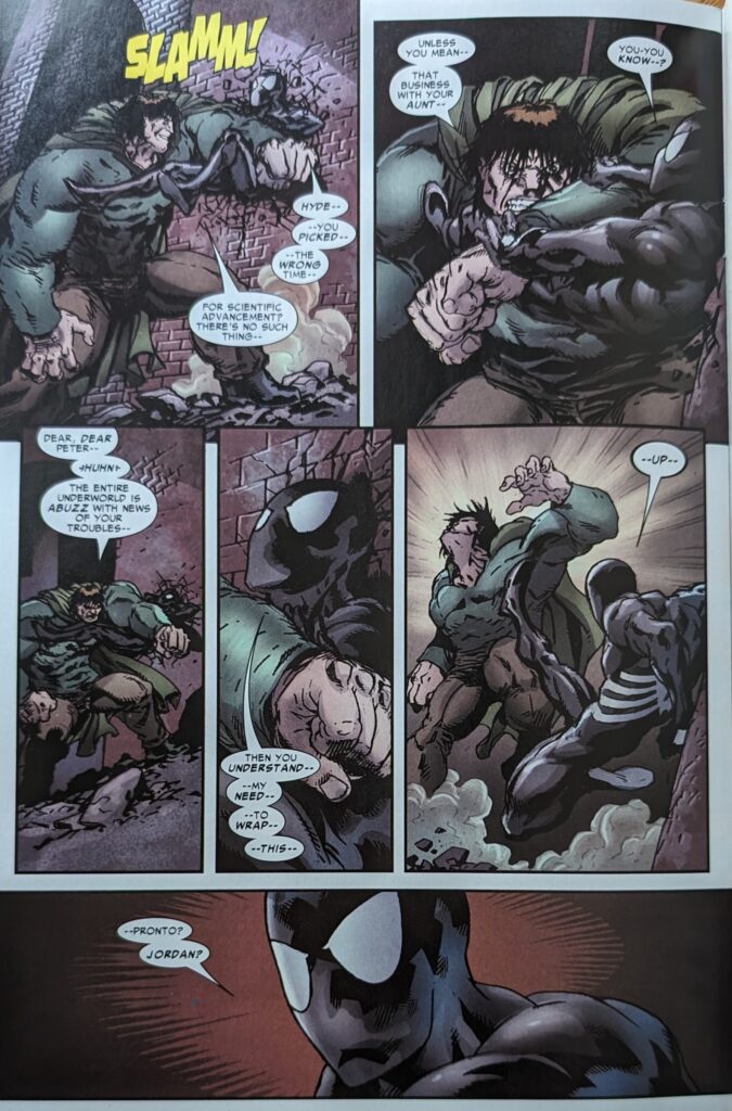 Jordan has mixed up some chemicals and plans to kill Hyde with them as vengeance for his mom (Why lie? Why not just kill her if he thinks that trauma is key to the whole Spider-Man thing? Mr. Hyde kills people. This is dumb). Spider-Man won’t let him, of course.