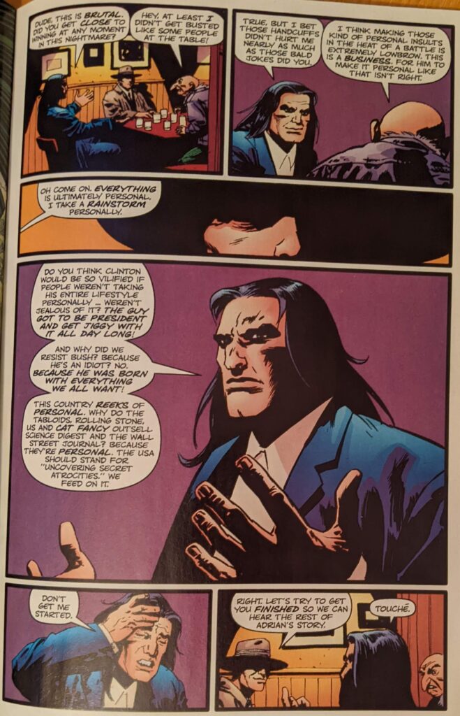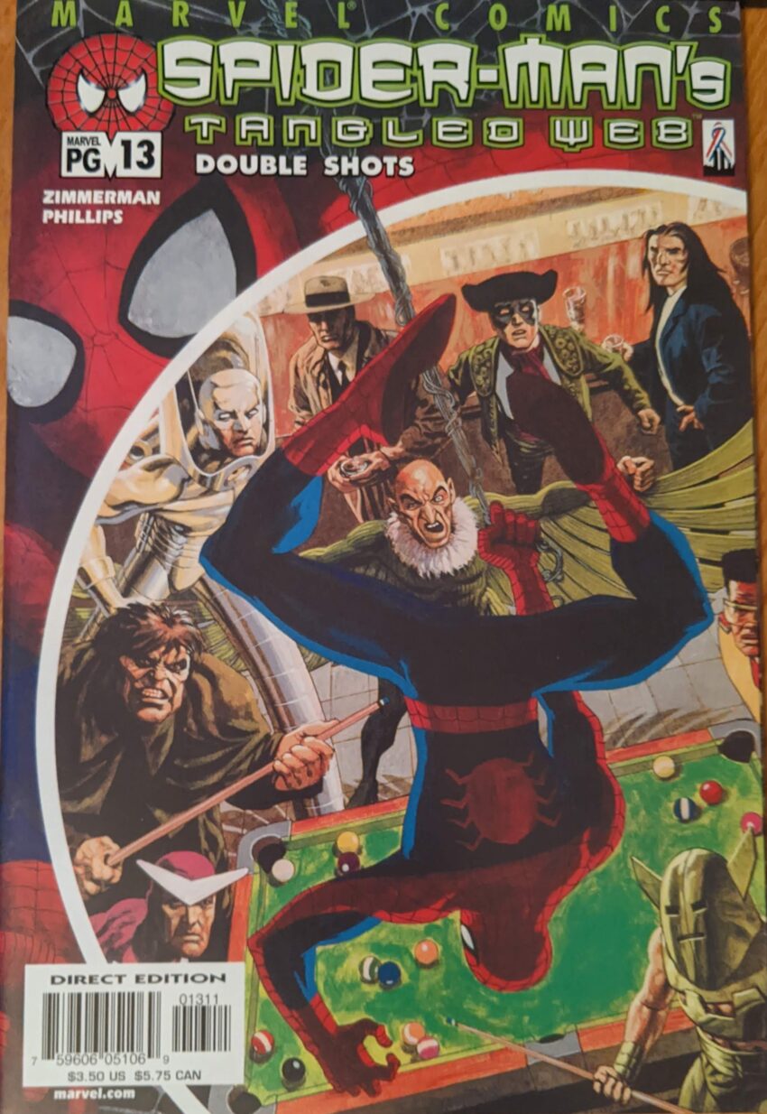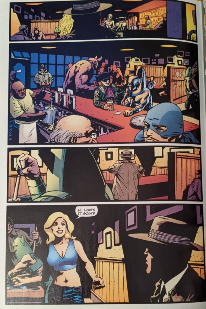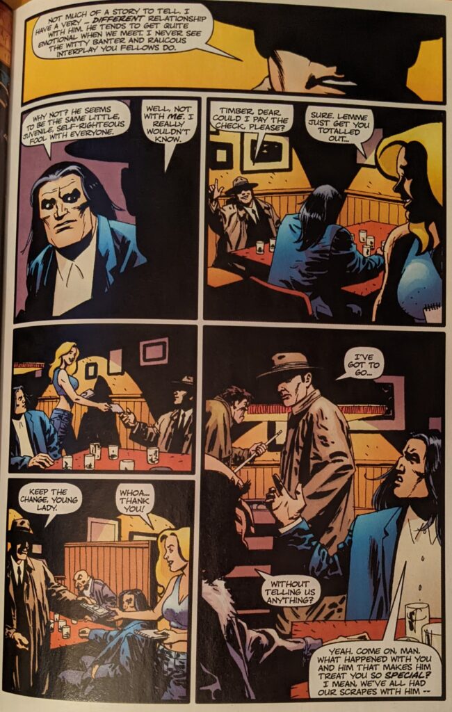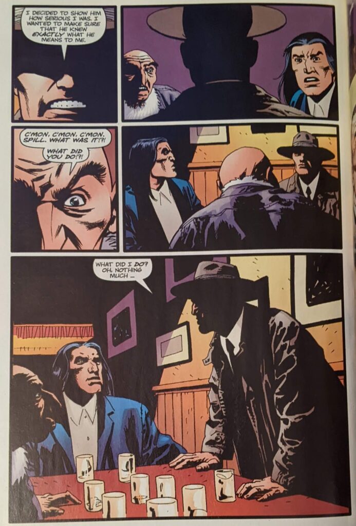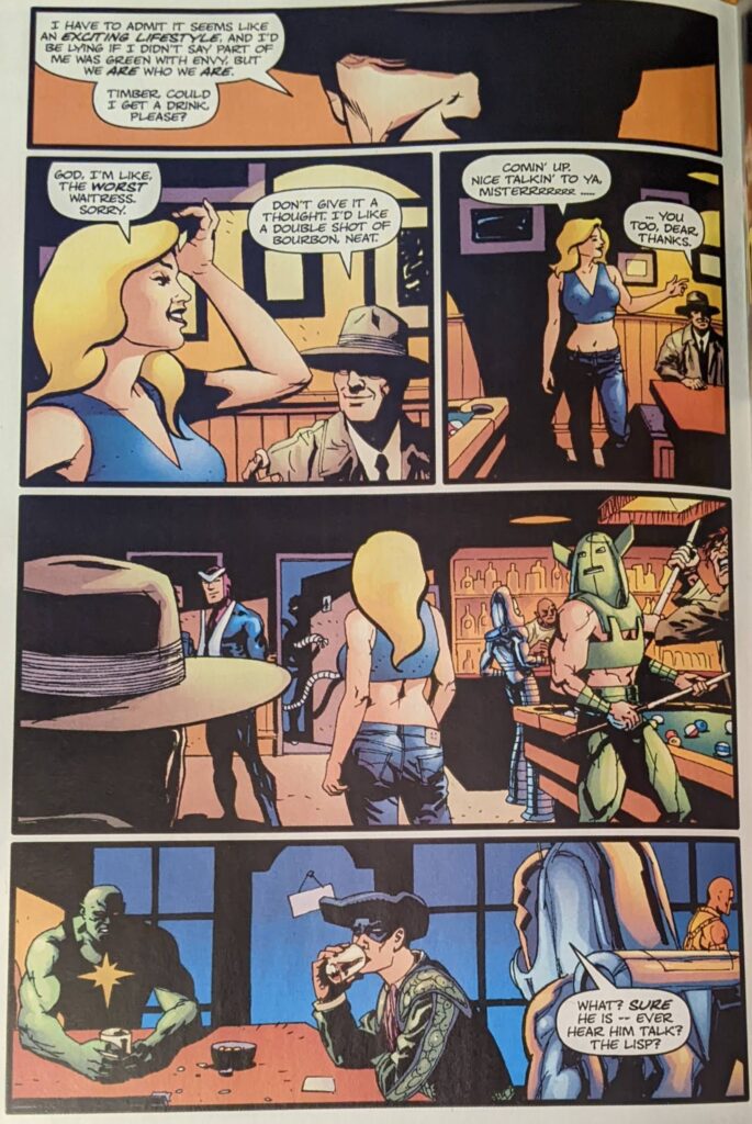 Ron Zimmerman is back, last seen in that awful Jay Leno thing. Sean Philips is back, last seen in Ultimate Spider-Man Super Special, tho I think this came out first, just to be as confusing as possible. Steve Bucellatto is back, last seen coloring most of this series. This one’s called Double Shots, and begins with a guy in the comic book cliche hat & trenchcoat disguise headed to a bar.