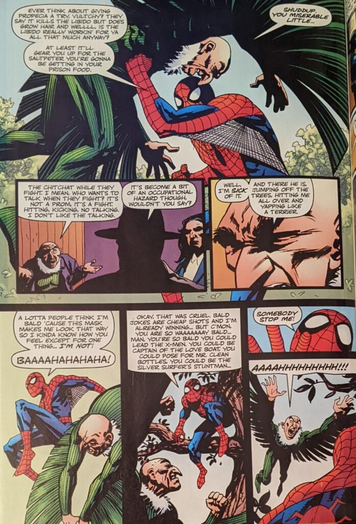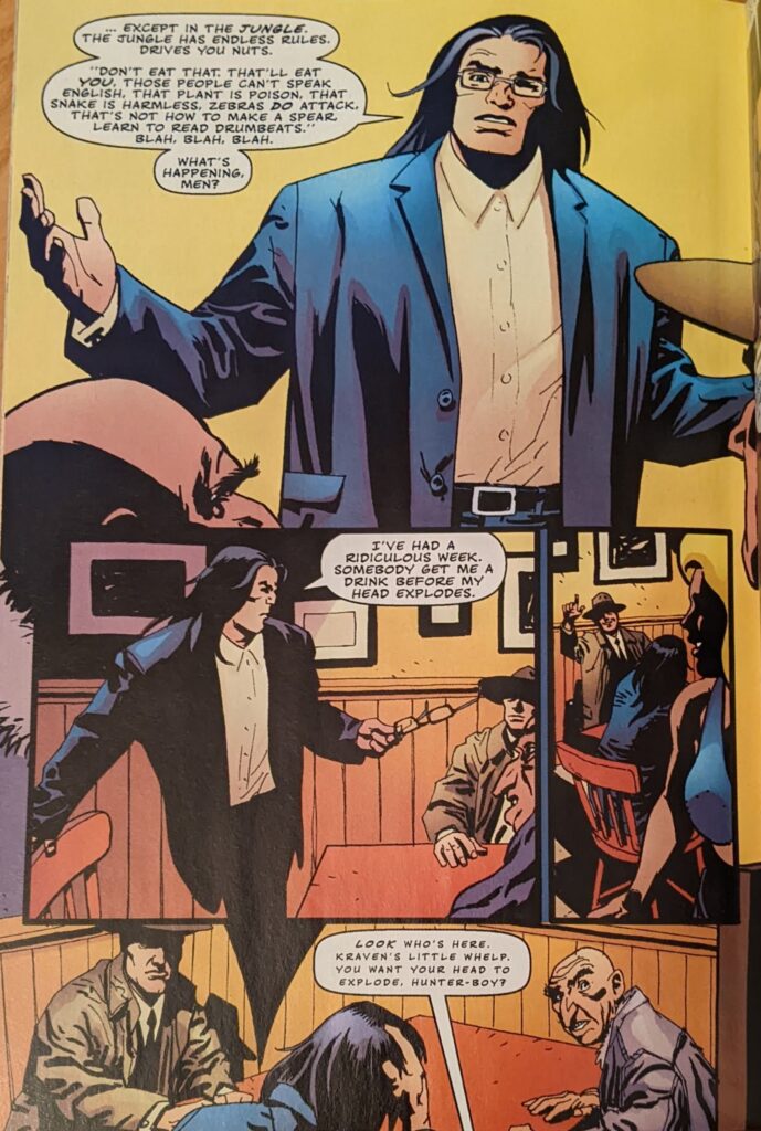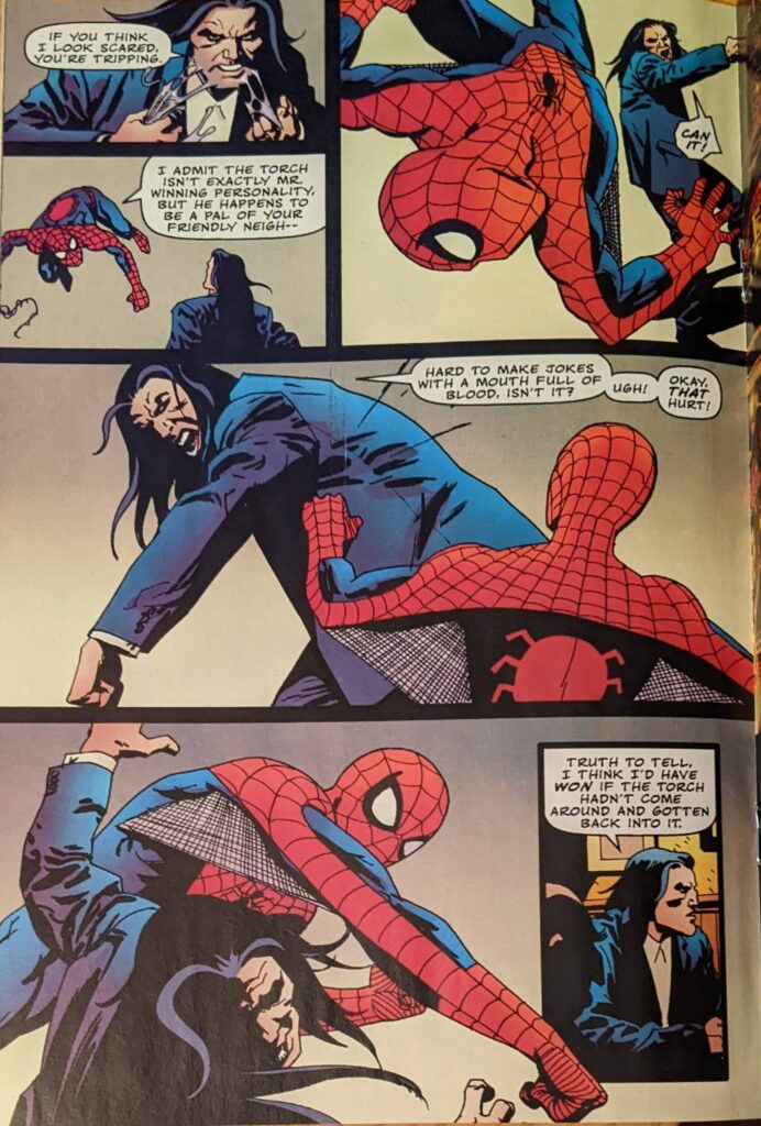 I feel the odds of Kraven and Tombstone having a feud, or even knowing each other, are effectively nil, but again, it’s Zimmerman. And because Alyosha is his guy at present, first he intimidates Tombstone into running away with just a look, and then it’s implied he’s been shtupping the hot waitress. I don’t know if they had the phrase “self-insert character” in 2002, but… Anyway, Young Kraven goes on to talk about how he also had a bad week due to Spider-Man, aided and abetted by the Human Torch, as Alyosha was fighting some mobsters and they intervened. The Torch says he “never liked” Baby Kraven, which, again, they actually met and the encounter (In FF, Vol. 3 #9) was so slight I doubt Johnny would even remember it, but Zimmerman. Young Kraven was winning against Johnny when Spider-Man showed up.