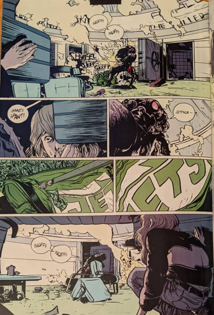 Art is subjective and all, but the inky, lived-in feel of Pope’s art is tough to beat for me personally. Down at the bank, the cops have just gotten the ok to use “the big guns,” and as Heather arrives, trying to sneak past the barricade, they fire some kinda crazy cannon at her dad, who actually shrugs it off. Heather sneaks past him and into the bank, where it looks like he’s already been inside and blasted his way into the vault. Then she hears someone coming, sounding like they’re in bad shape.