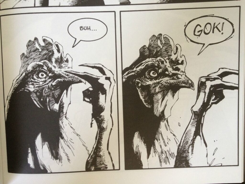Only McKeever could look at Typeface and go, “Eh, I can do quirkier.” So wacky. It is, after all, Ted McKeever’s Mondo which gave the world this set of panels, widely distributed on the internet without explanation: