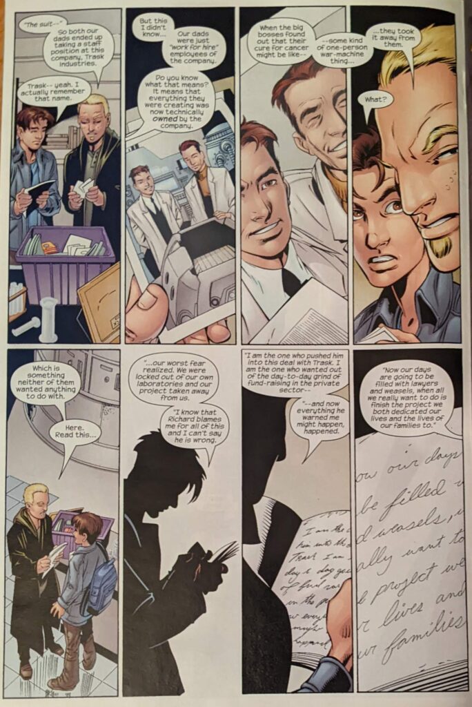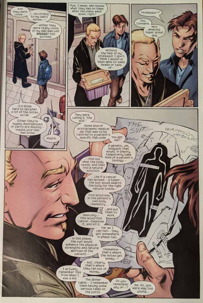 This issue picks up the second the last one left off, with Peter understandably asking Eddie what the goo is. He says it’s what their fathers were working on, what would have been their life’s work. He says it’s the cure for cancer.