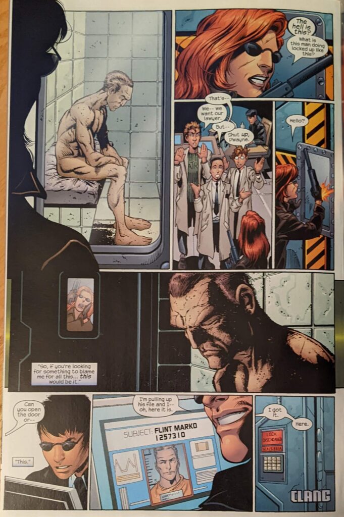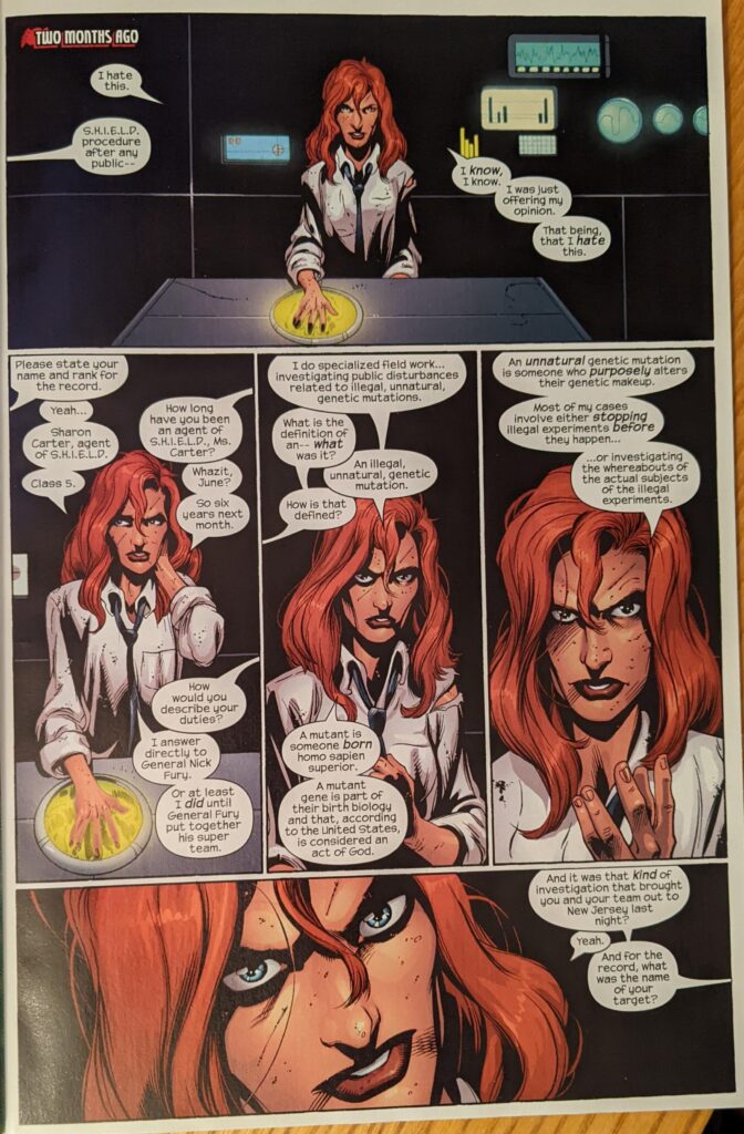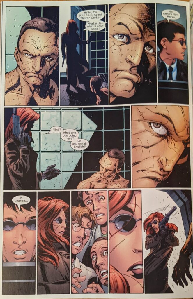 Hey, Ultimate Sandman! I wondered if he came back when we saw him back in this period, I did not remember. Really cool visuals on him, too, much cooler than the usual regular stuff. Sandy escaped, killing one of Sharon’s guys. Then we get a page of his profile from Hammer’s system, Sharon telling us he’s a career criminal loser who was doing 55 years in Rykers for a badly botched robbery, and no one knows how Hammer came to be in possession of him, but he turned him into a Sandman, and now he was on the loose. That’s where this get a little harder to swallow.
