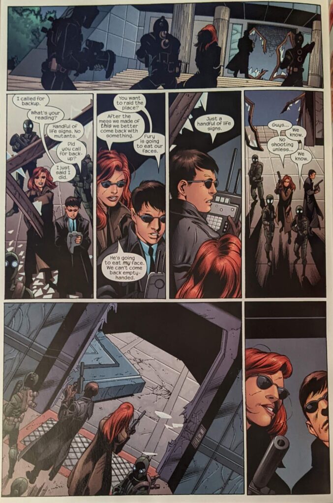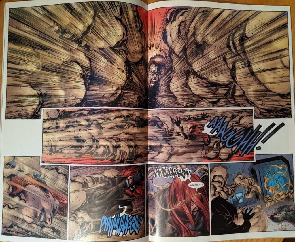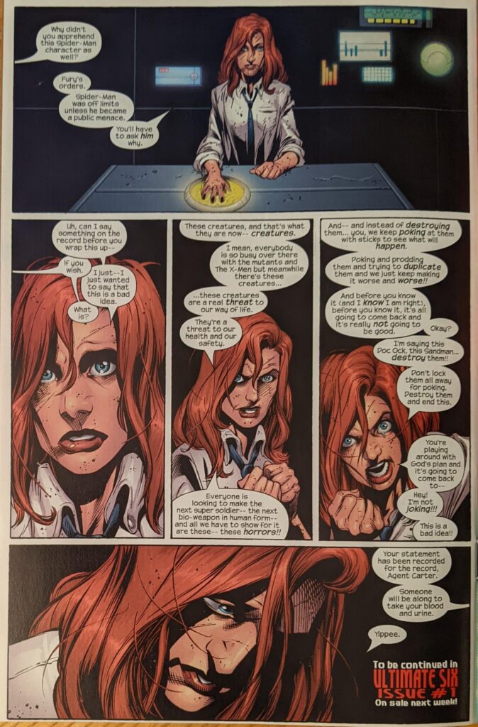 Our old pal Ultimate Sharon Carter. Certainly not to be confused with regulation Sharon Carter, with her red hair instead of blonde and that wicked scar. I don’t think they ever told us where she got that. She recaps the Doc Ock adventure over a splash of Spider-Man winning that fight. Sharon’s team was to bring Ock in quietly, and here he was doing his 2nd televised event. Fury was mad. Then she recaps her arrival on the scene, and Bagley redraws a single panel from USM 21 (The memorable “You lost your feed” panel), the rest are all from new camera angles, because he’s a consummate pro. Then we get what happened with Sharon after…