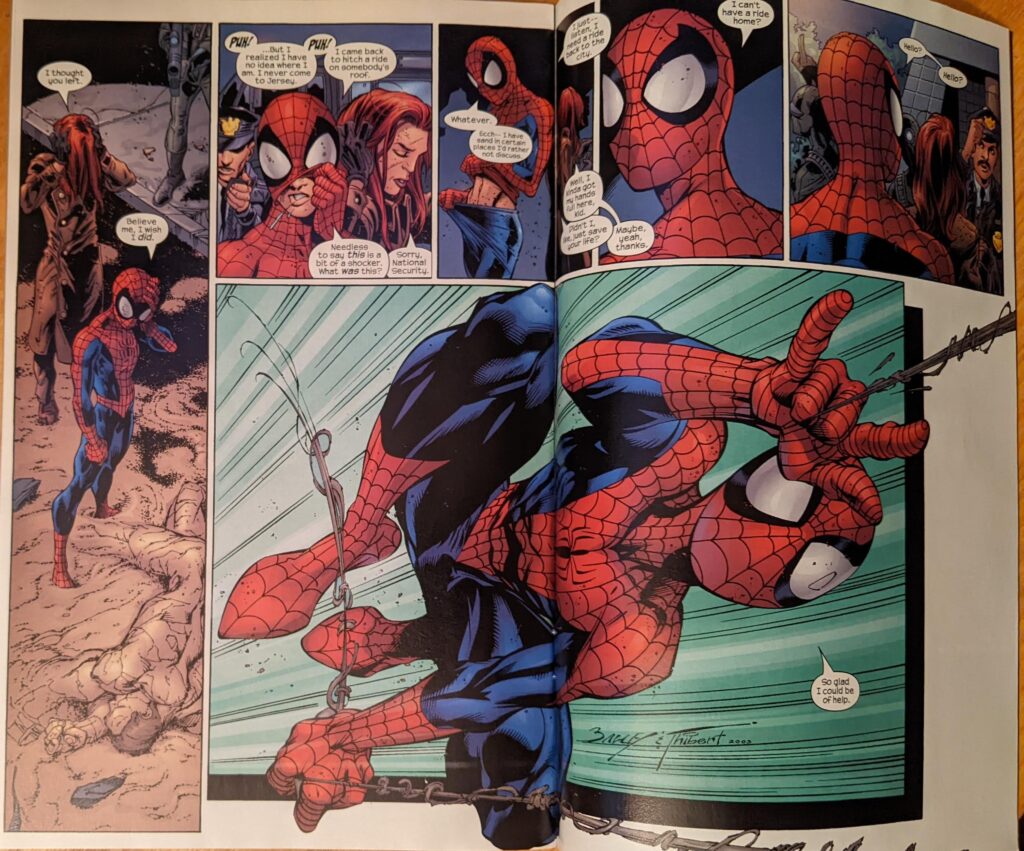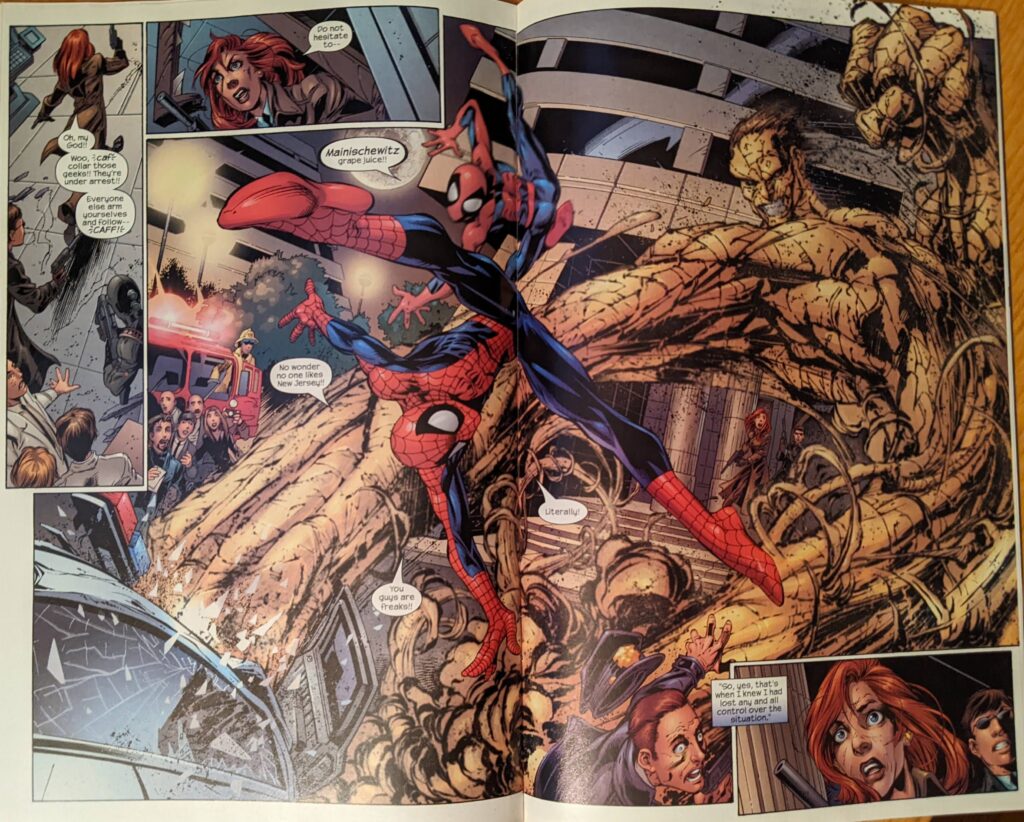 I mean, the fact that this happened during USM 21, but we didn’t see it is not impossible, but it’s somewhat implausible. It’s more than a little weird to me how B insisted on Peter constantly referencing Jewish culture, Jewish brands, speaking Yiddish, while insisting Peter was not Jewish. I dunno, maybe Marvel wasn’t willing to confirm a religion and/or ethnicity for Peter. Stan Lee was a shrewd businessman in making none of his characters espouse a particular religion or political side, so all readers could presume their heroes agree with them. But I mean, it’s 2003, Spider-Man can be Jewish (You can have your cake and eat it, too, make the mainline Peter a Christian and Ultimate Jewish). But if he’s NOT Jewish… he sure is into Jewish stuff, is all. At any rate, regardless of his ethnicity, Spidey is swatted away by a giant sand-hand and taken out of the fight for a bit. Sharon then shot Sandy in the head, and he spit out the bullet so hard it shot one of her guys. But then…