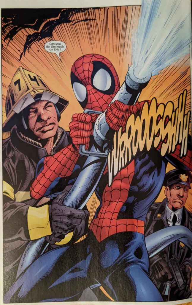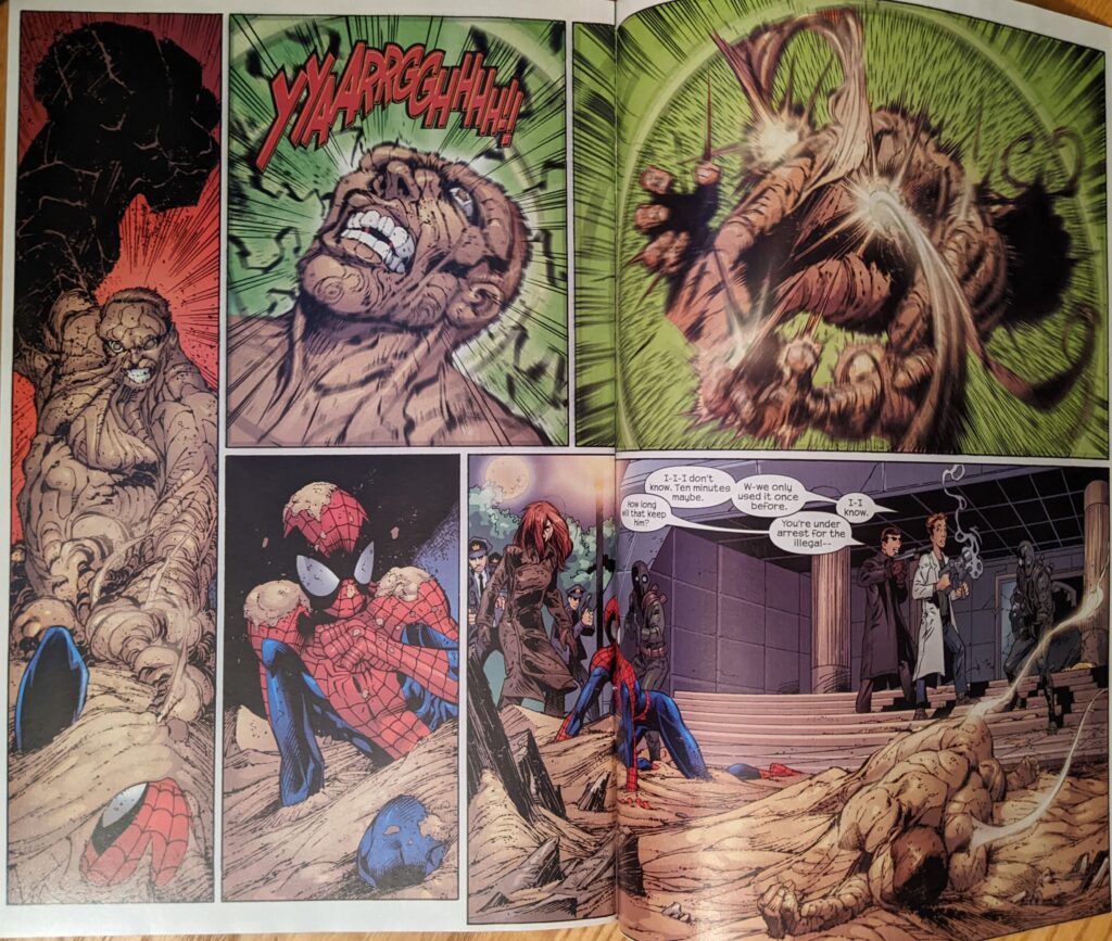 Very post-9/11 imagery. So, that stopped Sandman long enough for Spider-Man to ask Sharon if she was ok, but then a raging Mudman came at them. Spider-Man was cut off in the middle of a bad joke as he’s buried in sand, unable to breathe, the situation turning dire instantly.