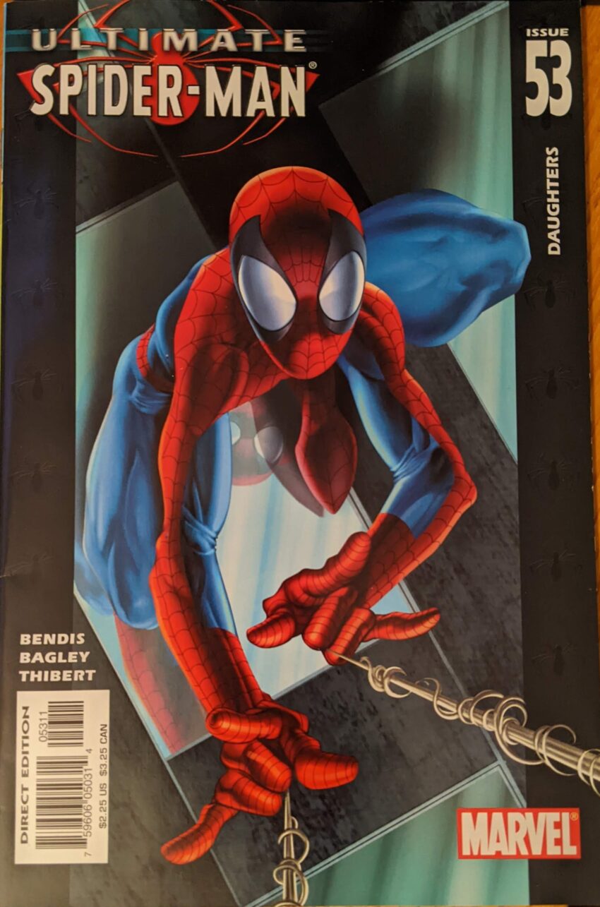 After 2 months of unusually specific covers, we’re back to generic for the big finish to this story. Who can know what motivated these covers? I still kinda wonder if Bags just made a ton of the generics while Jemas was in charge, and they’re burning them off where they can now he’s gone. But, hey, that’s not the thing, the thing is MJ ran away from home. May rushes to Peter’s room, but he’s not there. She rushes to Gwen’s room, but she’s asleep and doesn’t know where Peter is. Then May hears a noise downstairs.