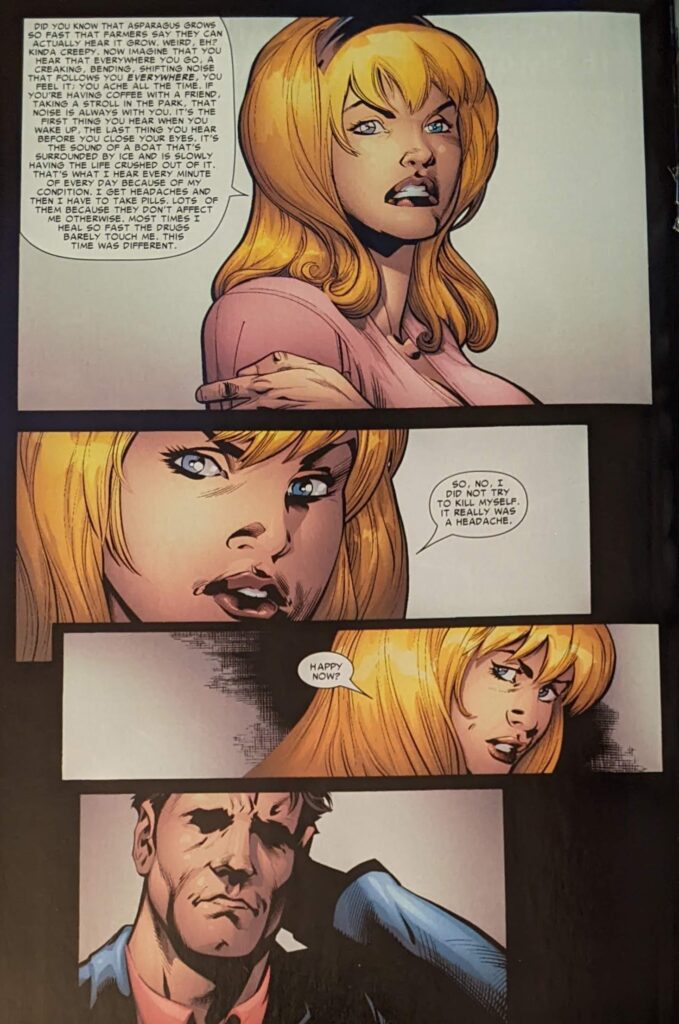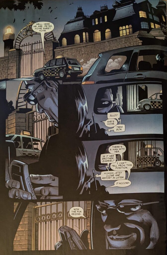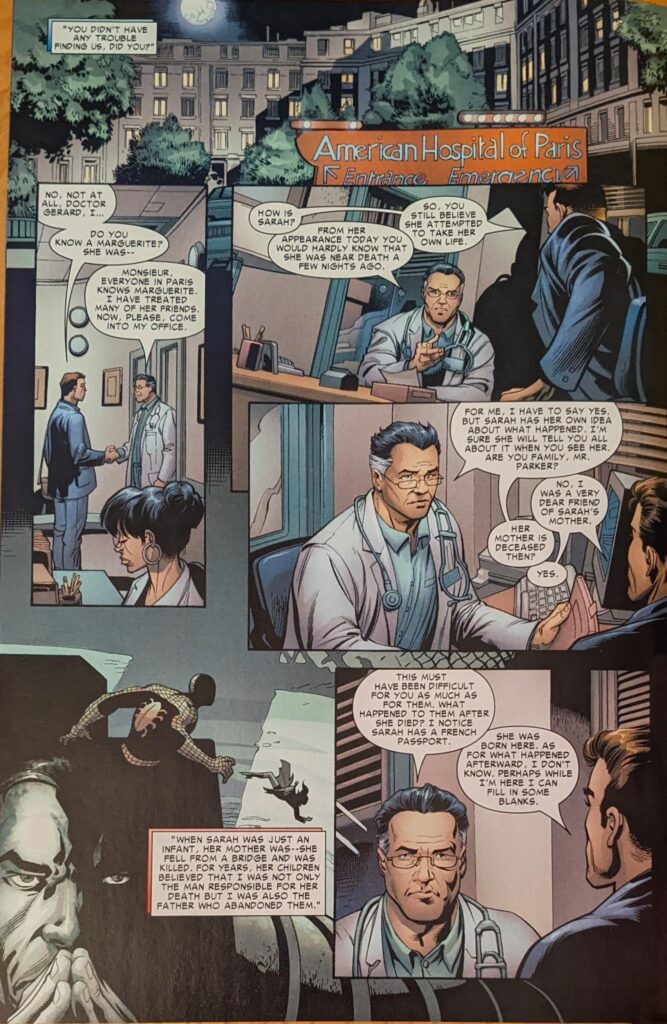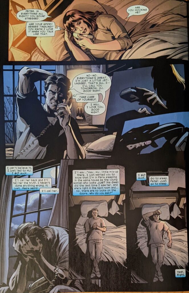 Boy that’s a big word balloon! The Bendis method of breaking a big speak up into beats is much better. Well, anyway, Peter says he wants to help, but they don’t really know each other, and he’d like to change that. He says he wants to see her Paris, the place she grew up. She says she coulda left the hospital any time, but wanted to see if he’d come for her. Starting in a weird place.