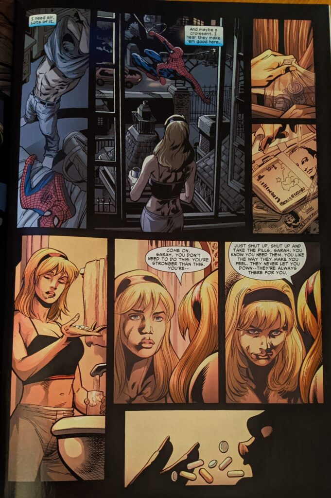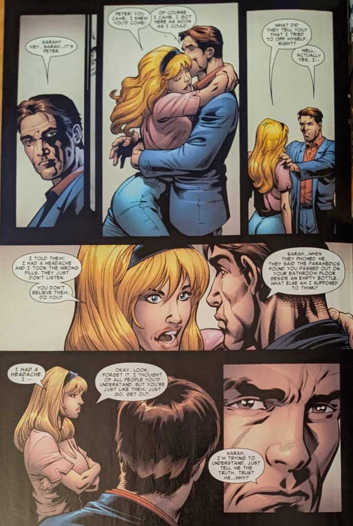 A lot of preamble today. This one opens with Sarah, still wearing that friggin Gwen Stacy headband, crying in a bathroom, with a caption saying “Please come quickly. She needs your help.”