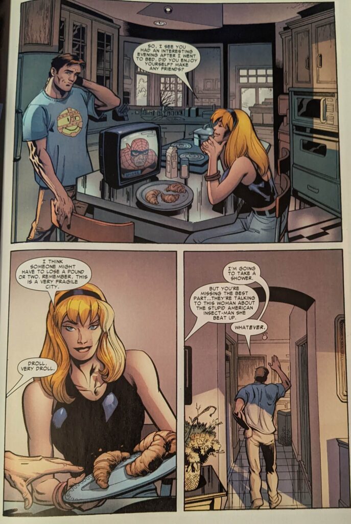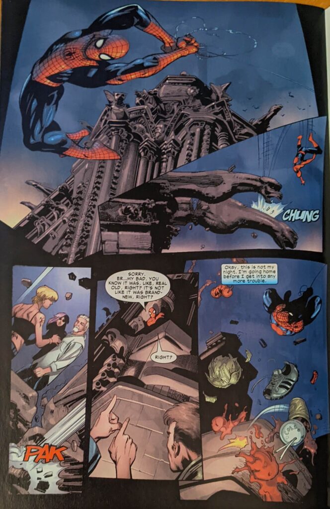 Ugh! Out on the town, Spider-Man attacks a guy who he thinks is a mugger, but it’s just a lover’s tiff, in French, which he doesn’t speak. Hot start to your Paris superheroing, buddy.