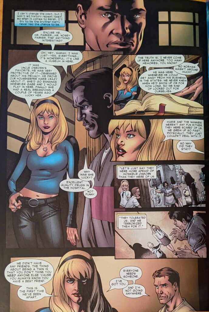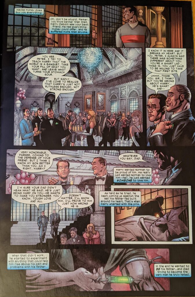 Come on, guys. The 60s Marvel material had been reprinted in a variety of formats, easily accessible at this point, why do they continue to screw up stuff like this? Peter never met any Osborn before college. Heck of a job on those backgrounds, tho.