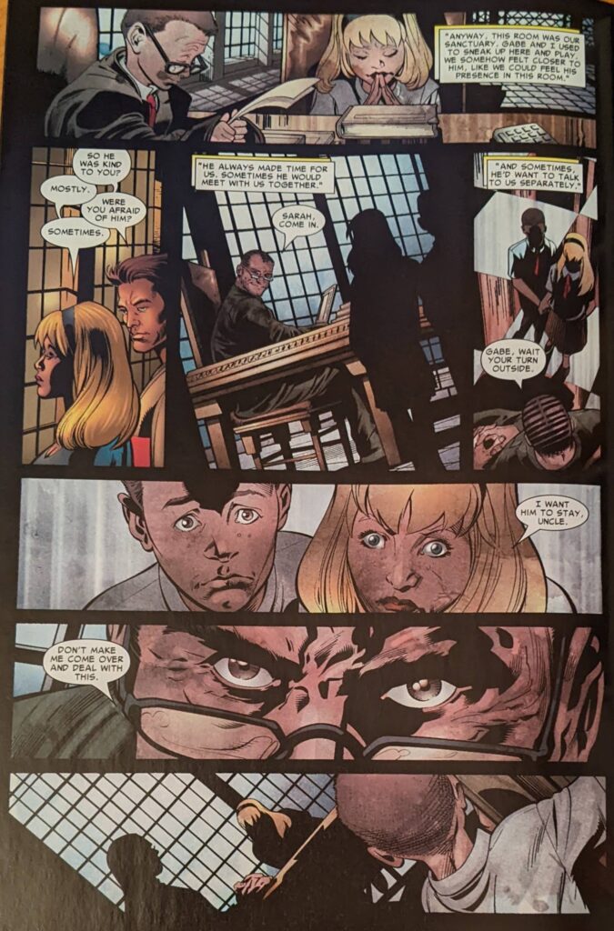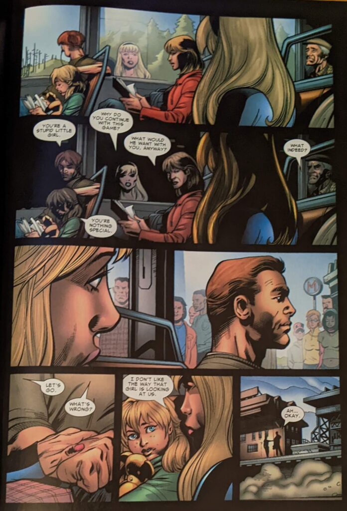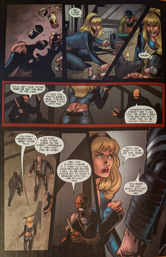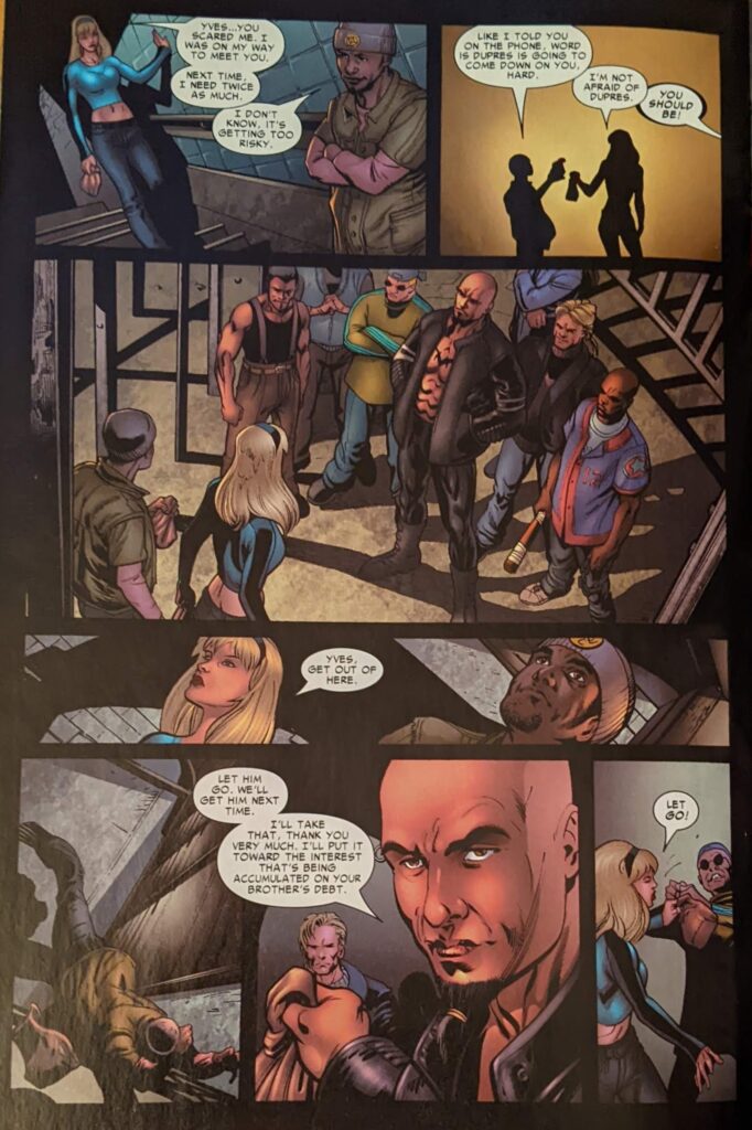 People running in fear from a fight finally get Peter’s interest, and he arrives to see Sarah having beaten up most of those dudes before grabbing her and webbing them out of there. Soon they’re in a train car, Sarah lying and trying to cover up what’s going on, Peter not biting. Also: