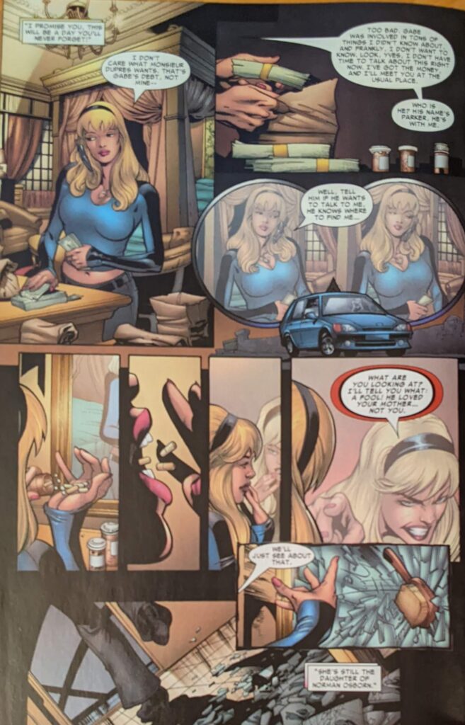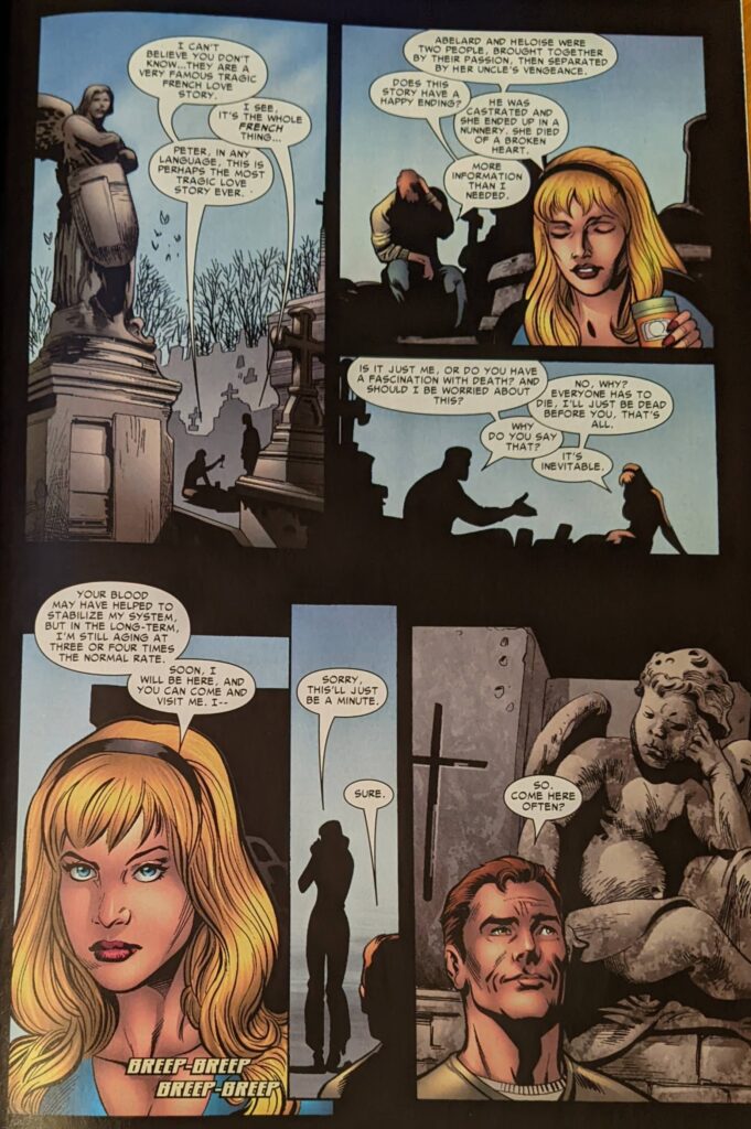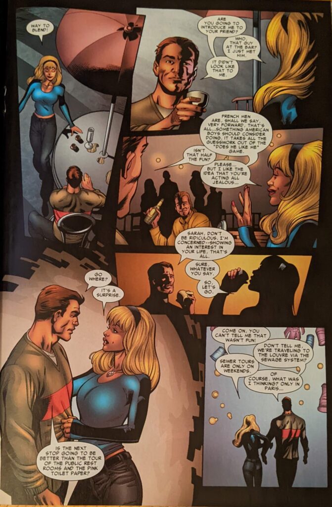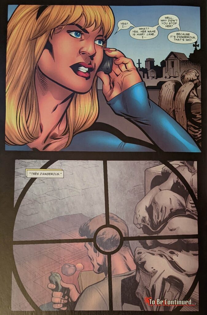 Boy, this is not shaping up to be a fun read. MJ is freaking out at Aunt May, portrayed as “worried she’s losing him” to a teenage lunatic who looks like Gwen. She ignores every reasonable thing May tells her and decides to go to Paris. I do not like this at all. This a very lame take on MJ. Peter & Sarah are at a cafe, having a nice time… sort of? Peter seems out of his element, there is some Komedy Business with him not knowing a cool coffee to order and falling out of his chair. This comic is really weird. Also some guys is spying on them, telling someone on the phone this American won’t be any problem.