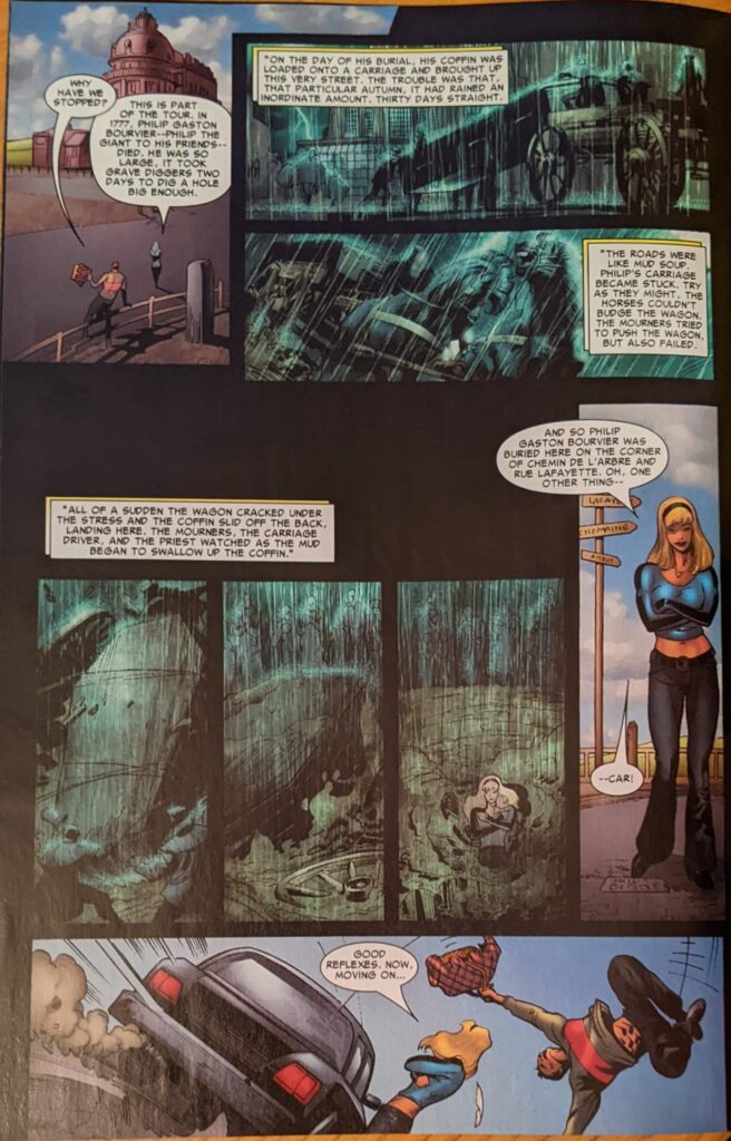 Noooo idea what’s up with this. Sarah says that Paris welcomes everyone (oh un mot?) and everyone has a secret in captions over MJ getting a taxi to the airport, a mystery man reading the paper, Norman in prison, and Peter looking in the window if a costume shop. Sarah lures Peter down into the subway, then says someone keeps trying to call her and she wants to go back up to see who it is.
