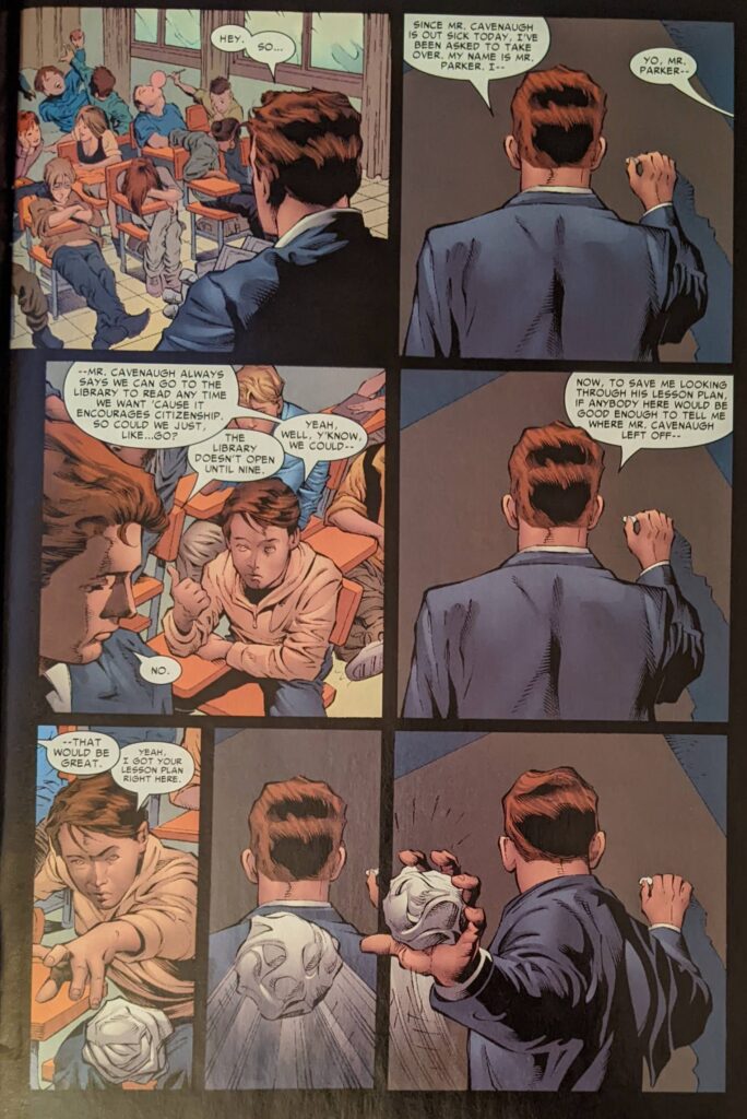 Now, finally, for the first time in this block, it’s time to check in with ASM. In a story that explicitly takes place after the first arc of New Avengers and this arc of TAC. I don’t often get such clear markers in this era. Well, J. Michael Straczynski, you’ve just unleashed one of the worst ideas in the history of Spider-Man (Tho at least he didn’t turn into a giant spider, die and give birth to himself, I guess!), what do you do now? The answer may surprise you, but not in a good way. In his newsletter, Tom Brevoort has made repeated mention of an internal edict by Bill Jemas that covers should feature a single figure, preferably female, preferably scantily clad, preferably bending over. This Gary Frank cover feels like it coulda been done under that regime but for Spider-Man. We open on Peter late for work, thinking about how he’s found no trace of Gwen’s kids as he unloads supplies from… from the trunk of his car. Peter Parker does not have a car! Peter Parker famously doesn’t know how to drive!! Where did this car come from!? Ugh. Well, he’s in trouble with the vice principal for being late, especially because they left a message telling Peter he’s covering for a “remedial citizenship” class because the regular teacher is out. I guess that’s a joke? Peter asks how it’s possible to be remedial in citizenship, but does not get an answer.