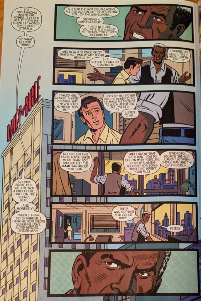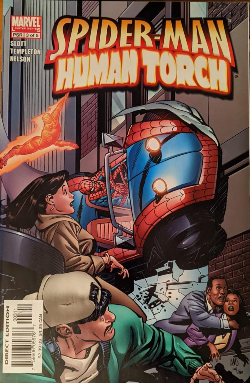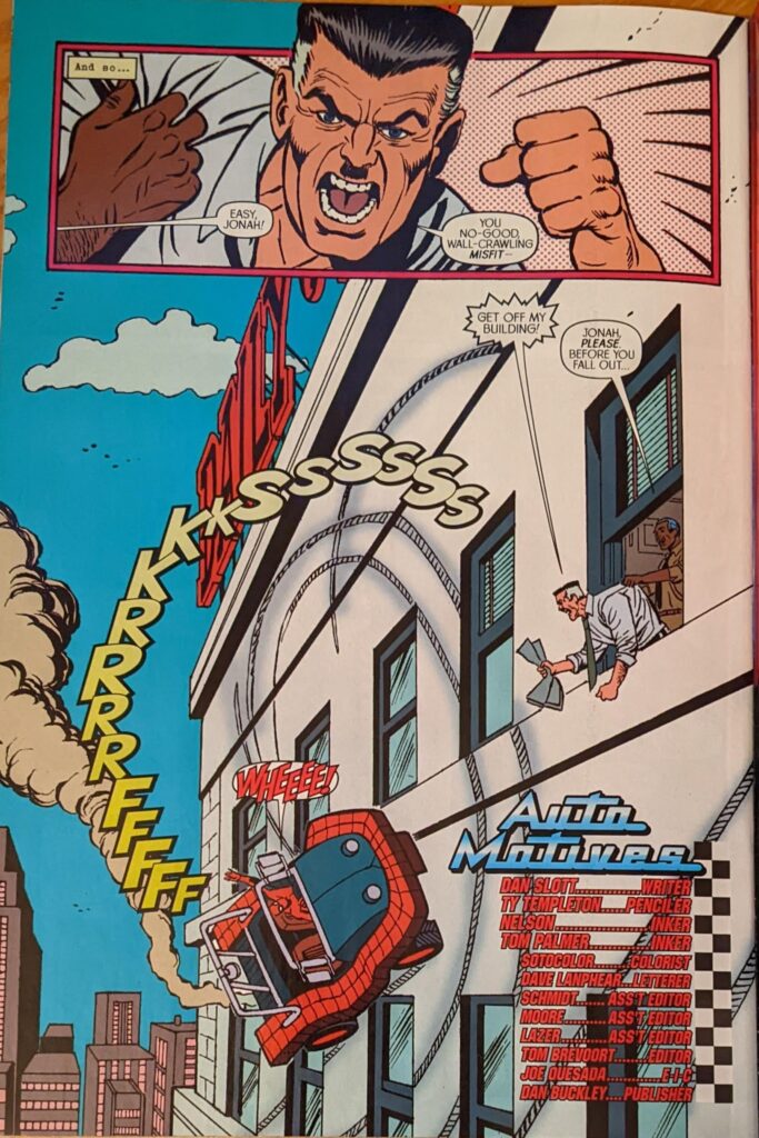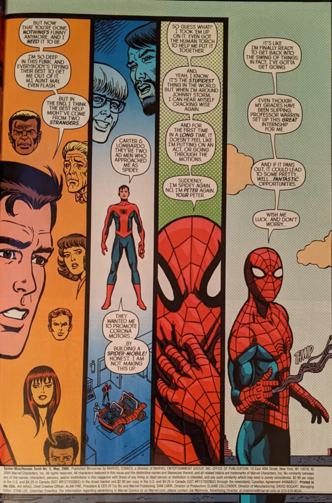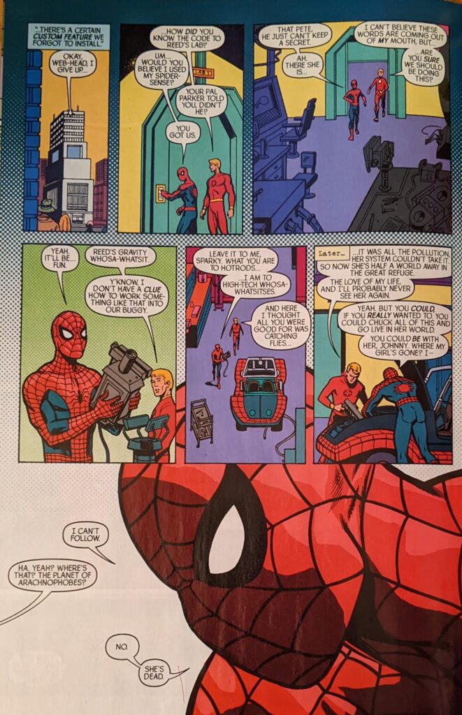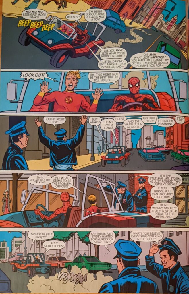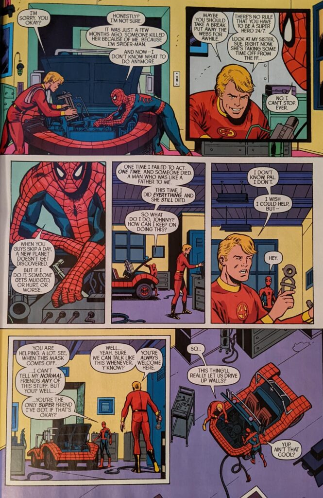 Rude. I like Peter going to Robbie, tho. Coulda used that in the real books. Well, Johnny Storm is working on his car, wondering if he’s not as cool as he thinks, and missing Crystal when Spider-Man shows up and asks for a driving lesson in his silly car, and Johnny is almost relieved for something to take his mind off things.