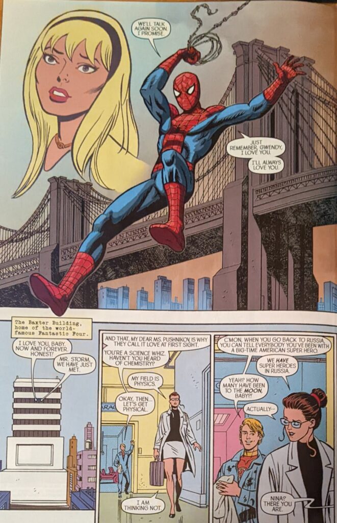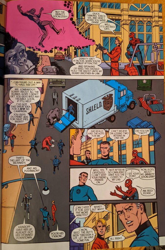 That Russian lady is an intern with Reed, it appears, and so is Peter Parker. That seems like a big deal to retcon in there like this. Nina is excited to meet Peter, having read his paper on “advanced adhesives,” and Reed helpfully adds that Peter is a genius, “tested right off the charts,” getting the same “scores” he got at Peter’s age. On… what test? Johnny is feeling dejected. Then Reed just starts using his “gravity localizer” on everyone without warning or consent, making them all walk on walls, like Peter is used to. Random. Later, Peter is given a passcode for the lab in case Reed in unavailable, and then he and Nina leave. And then thing about Nina is, she’s a Russian in a pastiche of a Cold War-era comic, so…