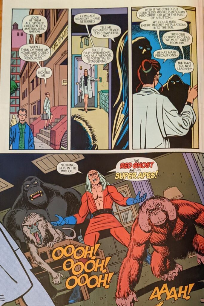 A nice moment between the two at a time where it really doesn’t fit. They weren’t really this kinda close back then. But… I guess they are/were now. While they’re doing that, the Red Ghost is breaking into the Baxter Building to steal the thing they just put in the car. RG is furious he can’t find the machine, but, Ninan knows where it is, because…