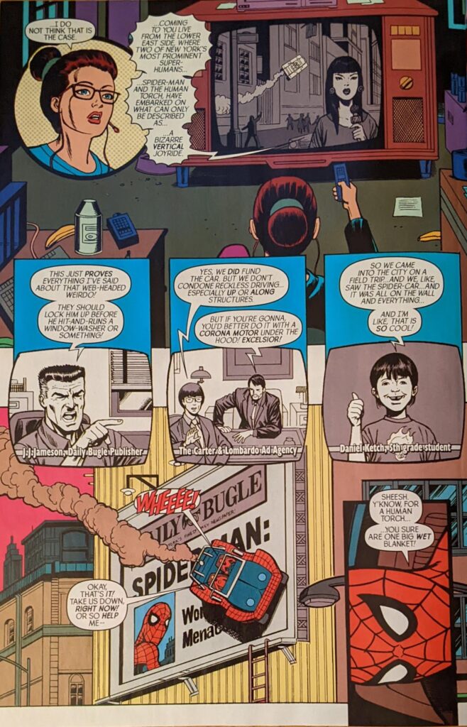 Spider-Man absolutely is wanted for murder, tho. Like that 3rd panel banter. The boys see Stilt-Man, but they’re stuck in traffic, so Johnny says to just pull over. But Spidey has no idea how to parallel park, and next we see, a TV says Daredevil stopped Stilt-Man as Johnny and Spidey get lunch… and then walk back to the car to find hoodlums have stolen its wheels. Johnny says this thing is driving him up the wall, and that gives Spider-Man an idea.