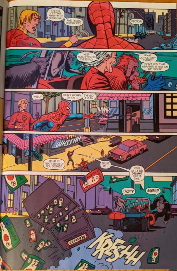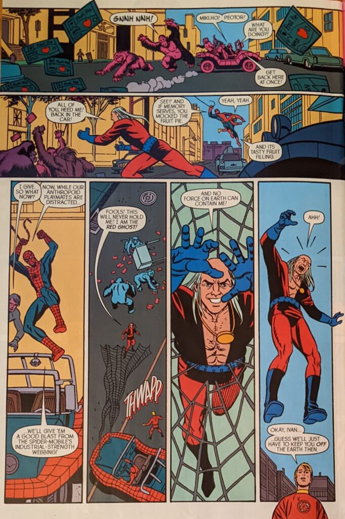In the instant classic Marvels series, Kurt Busiek and Alex Ross had a little fun having future Ghost Rider Danny Ketch appear as a little boy on a bike with a newspaper route in a story taking place the day after Gwen died. And here he is again. That’s funny. Well, the boys get the car on the ground just in time to seemingly hit a pedestrian, but Johnny thinks it almost looked like the car went through the guy, and when they get out to see to him, he turns out to be the Red Ghost. What a bizarre and impossible to execute plan. And it gets more absurd as he has the Super-Apes steal the car while he’s distracting the heroes. An orangutan is driving a car in this comic. Spidey webs onto the bumper and gets dragged along behind it as Torch shoots fire at RG and hits a hydrant through him, soaking himself. Then the gorilla rips the fender Spidey’s web is attached to off the car, they pick up their boss, and this absolutely ridiculous heist seems to have been a success. And then… due to the time period… the solution to this problem presents itself.