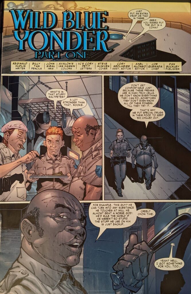 For my part, I bailed on his Black Panther the minute Romita was done (#6), and didn’t read the rest of Hudlin’s run til more than a decade later, digitally. And that first arc with Johnny wasn’t even over when Hudlin got his brief stint writing this title alongside it. And given the amateur hour quality and seeming disrespect for the material on almost every page of those 6 issues of Black Panther, well, I did not want to see this guy’s Spider-Man, to put it mildly. But… he wrote part of the big, terrible crossover looming in the near future of this blog. So that left just 6 issues of this title that I didn’t have, like I said. Thus… here we are. I could not possibly be less excited. Not least because Hudlin is paired here with Billy Tan, an up and coming artist at Marvel who, frankly, was not very good. Not ready for primetime. How he winds up drawing New Avengers is completely beyond me, but that’s years in the future. So! Sure-to-be-bad writing AND bad art? And I bought these comics, anyway? Like, recently, like weeks before I’m typing this? The real villain of this story is me. This run has covers by Steve McNiven to hide the art inside from unsuspecting buyers. Inside, John Sibal inks and Avalon Studios handles color.