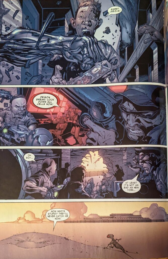 Boy oh boy. I bought this on purpose. This comic sucks so bad! Billy Tan comes to Marvel from Marc Silvestri’s Top Cow imprint at Image, giving him something of the same lineage as Talent Caldwell. Both guys who were working in the general house style of that company, and you can see it. Caldwell is a lot better, tho. This entire scene is so lame and cliche and stupid, but also awkwardly paced, like Hudlin’s Black Panther. This is only part 1 of 6! I’m not even halfway through it! Uuuugh, the next day, Peter catches the subway to work when the car slams to a halt because Absorbing Man is tearing things up nearby for some reason. He was in a desert at the top of this issue, and now he’s in New York. I didn’t know he could teleport. So, Peter ducks out of and… I guess under the train? The images make no sense. And he loses his keys as he turns into Spider-Man in a 2-page spread that makes you turn the book sideways, like Romita, Jr. was really into in the late 90s, only this one looks bad. And guess what?