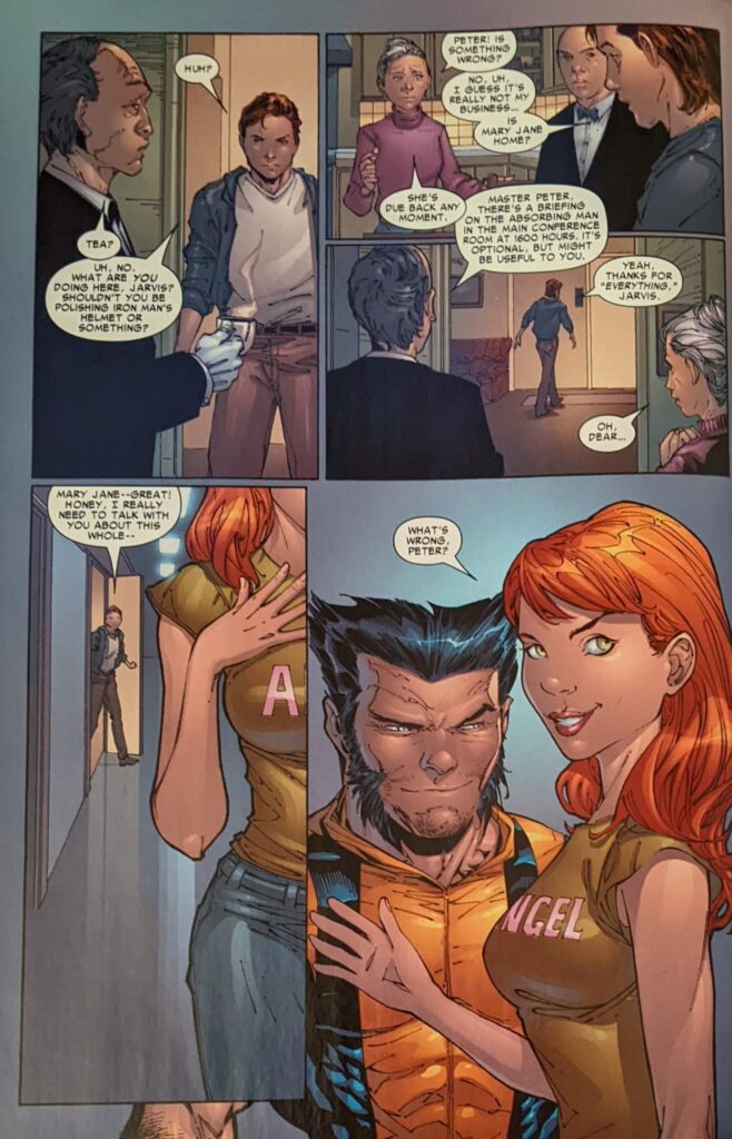 Everyone’s talking about polishing Iron Man’s helmet these days. Look at this art! Every visible part of MJ is a different proportion in that last panel, and none of it matches Wolverine! Sheesh, man.