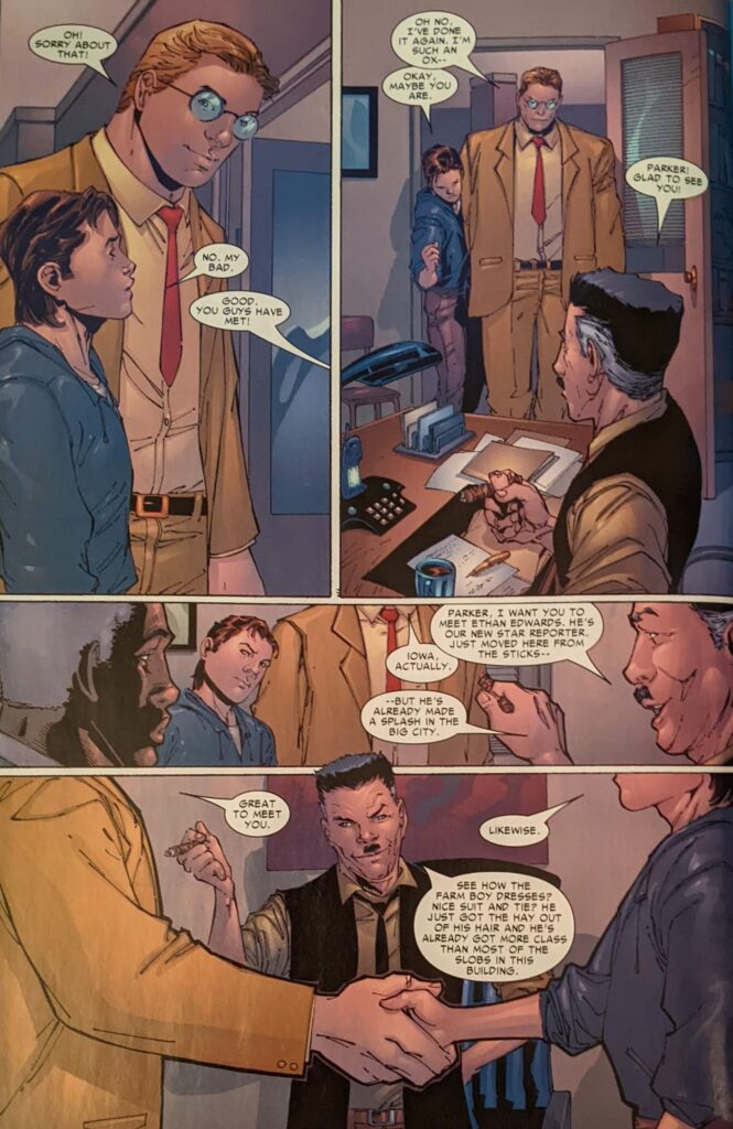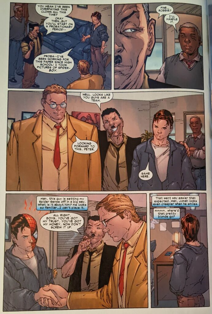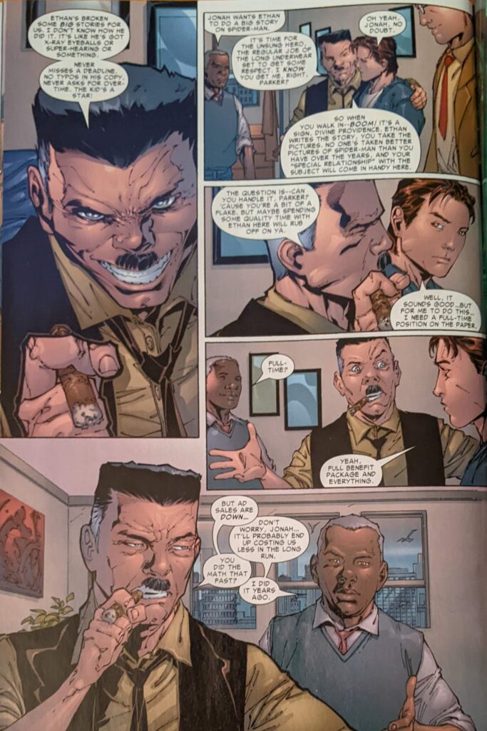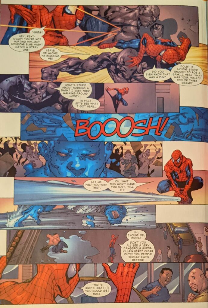 Tan draws Spider-Man’s mask eyes like Spawn’s. Awful. Absorbing Man came into this scene throwing a car. We only know he robbed a bank because Spider-Man says he did. A bank is pictured in the background of the 2-page spread prior to this, that’s all the setup we got. This typical Hudlin storytelling. Choppy, missing pieces. The two continue their fight, with Abs Man becoming pavement and then metal, but then… he gets an upset stomach and throws up a bunch of black top. That makes zero sense. He throws up A BUNCH of black top. He covers Spider-Man in a pile of rubble. How? Why? He just leaves. Spider-Man is apparently unable to dig out of a 6 foot pile of loose rocks in time to stop him. And then Spidey just gives up and goes to work. Where he is fired from teaching summer school for being late. An administrator tells him they overstaffed, and “we just figured whoever would make it here first would get the last job.” That is comically unprofessional. So, now Peter has to find another way to… pay the bills? He’s living for free in Avengers Tower, but he’s worried about money. Elsewhere, Crusher is indulging in some unspecified pills when some lady shows up and says her employer will keep him in drugs for special favors. One wonders where Titania is in all this. Hudlin probably doesn’t even know about her. Then we cut to Peter crawling back to the Bugle for work, where a giant man is in his way at Jameson’s door.