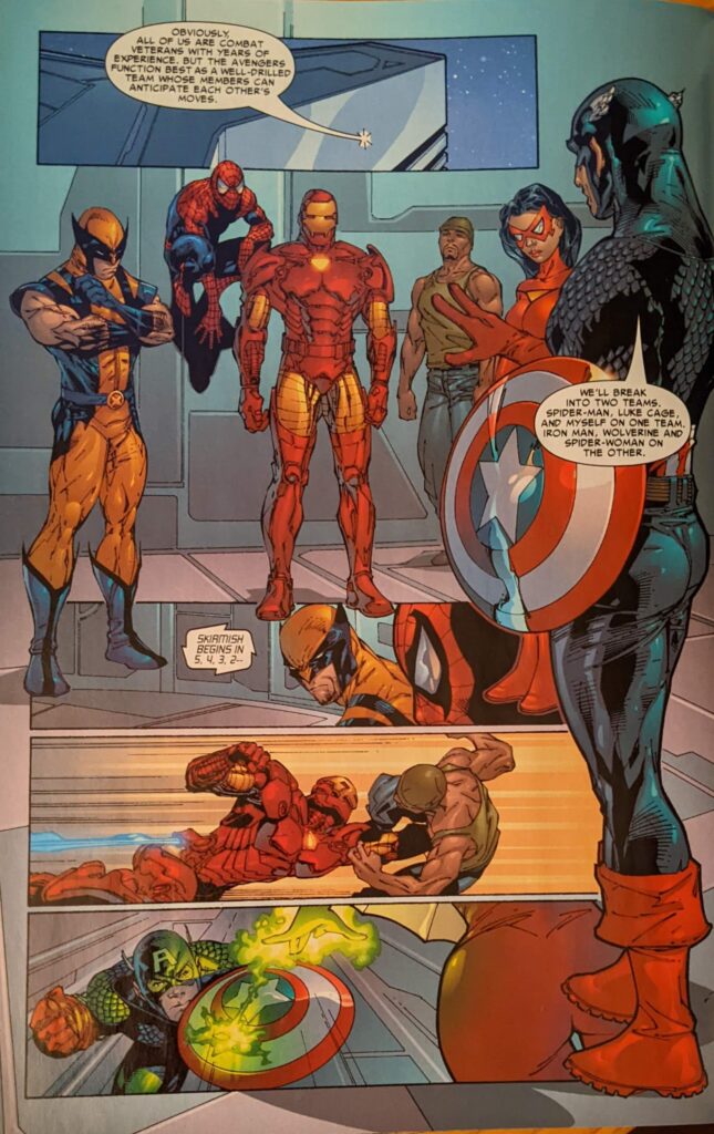 Ok, it’s straight up hilarious that Tan draws the Iron Man armor better than Finch does. That’s embarrassing. He’s got Cap with that tiiiiny wee shield and no star on his back, he’s apparently made up a new mask for Spider-Woman, and he’s drawing Iron Man better than Finch. Insane. Cap’s training plan allows Spider-Man and Wolverine to square off, of course, and that somehow goes this way: