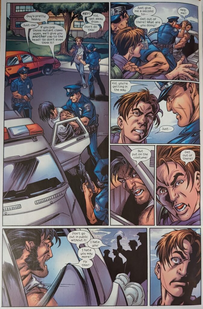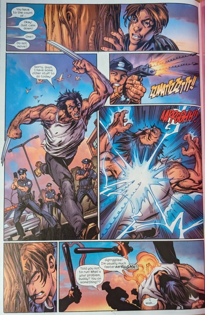 Cut to Peter accepting his prison stay (“At least it’s quiet in here”) when a kid in a Spider-Man mask busts in, trouncing cops, one of whom accidentally shoots Peter-as-Logan in the head. Logan tells Peter how to stick a claw in the lock on his cell, and they run for it.