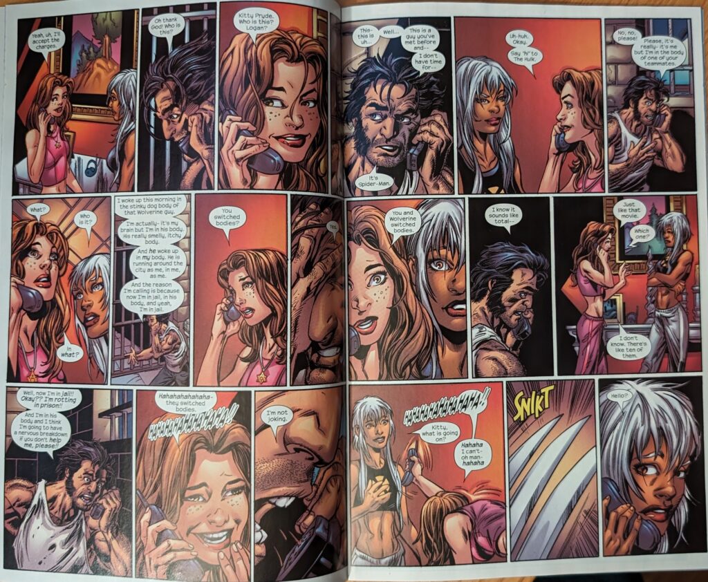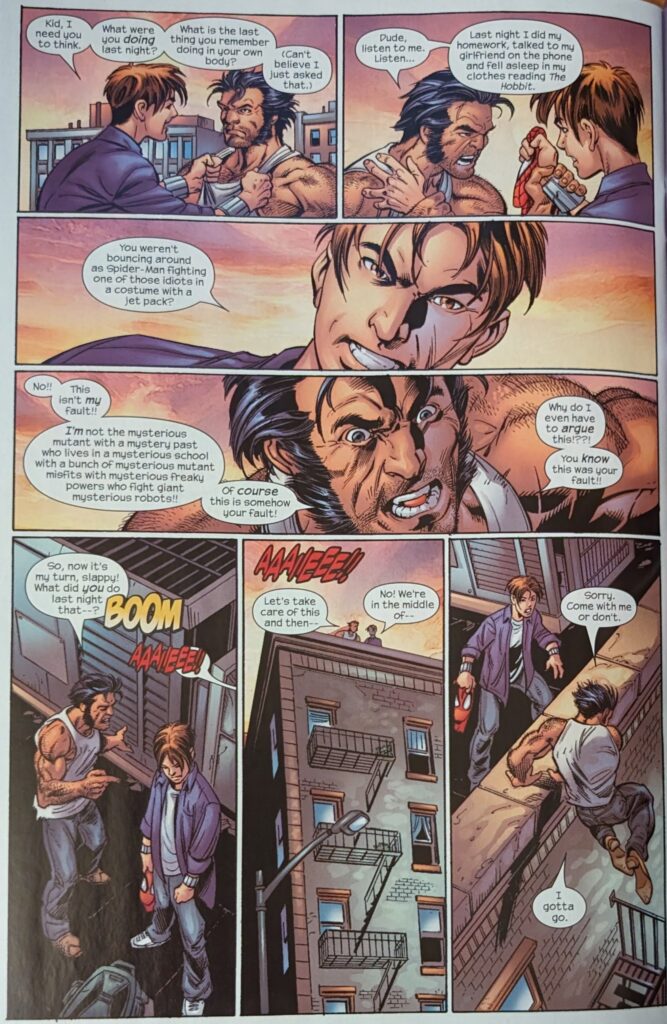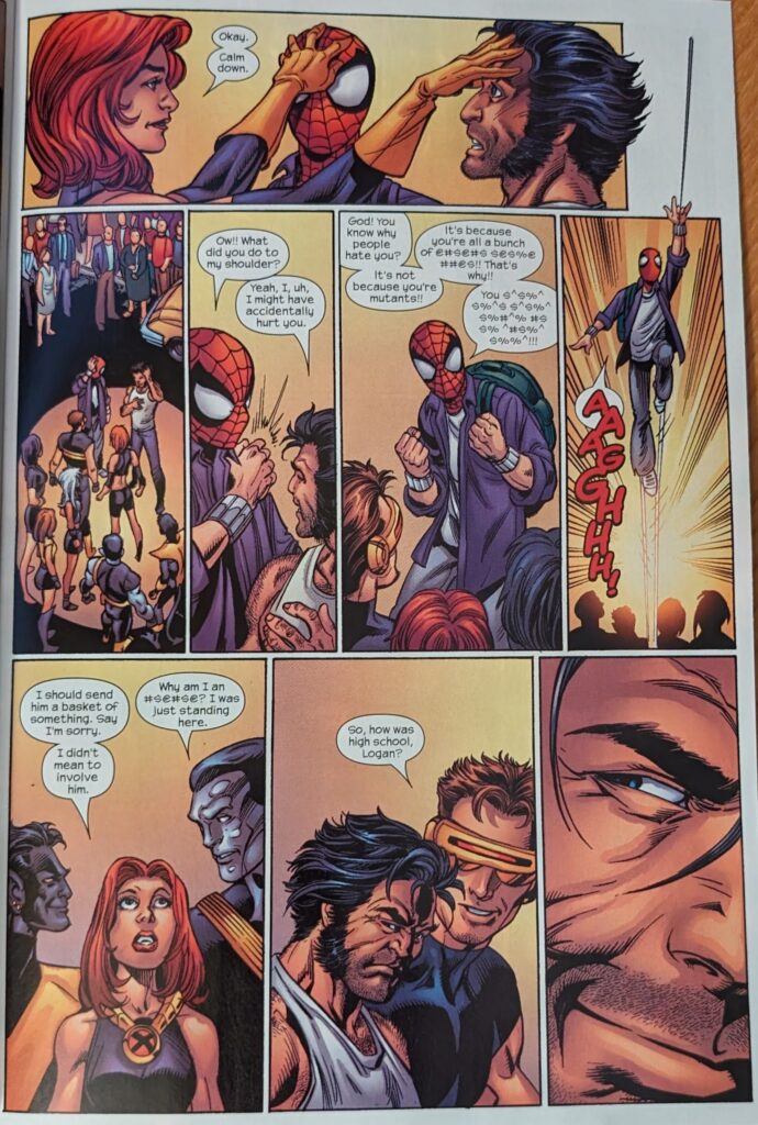 Now, me, I think I woulda told them I’m Logan and I need to be bailed out of prison, and let the whole identity swap thing get talked about after, but then, that’s not as funny. He gets tased again for accidentally killing the phone. Meanwhile, James “Logan” Parker makes a way bigger stink about refusing to wear the Spider-Man suit than an X-Man should, but does put on the mask. He figures out how to shoot webs and climb walls, and he’s off. Sort of.