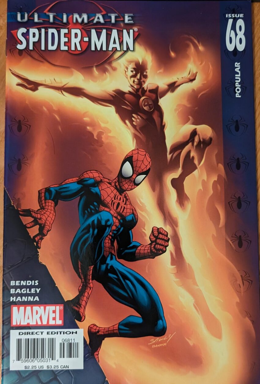 Well, look who it is. After all these years making fun of the Ultimate Universe for retconning its original FF out of existence, the 2nd Ultimate FF has finally debuted (Cover date February 2004, the same month as USM 50 & 51, for those scoring at home). My long-running snark about every reference to them not being canon is no longer necessary! Now, they’re all teenagers for some dumb reason, and they live & work at the Baxter Building, in a scientific thinktank run by Sue & Johnny’s dad, and Dr. Doom is a homeless guy in Latveria with goat legs who controls an army of little robot insects. Or maybe that hasn’t happened yet. Ultimate Doom is one of the worst ideas of all time, and was swiftly retconned into something more like the original. Anyway, here they are, the Ultimate Fantastic Four…