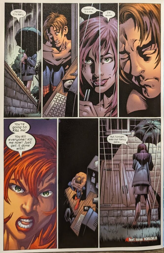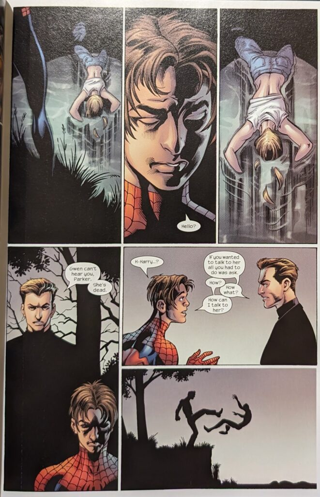 Why is Kraven there? Perpetual joke Kraven the Hunter alongside Carnage and Doc Ock? Spider-Man trapped in his nightmares is another situation where it’s a hoary old cliche, but also the first time we’ve seen it for this particular Spider-Man, so it’s kinda fun. He is forced off the roof of a tall building by Doc Ock, and chased by everyone who’s ever scared him (And Kraven) as he plummets to the ground. But when he hits, he’s back in the video of the Parkers and the Brocks he found. But then he sees the whole gang as corpses, except for…