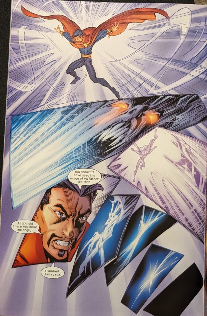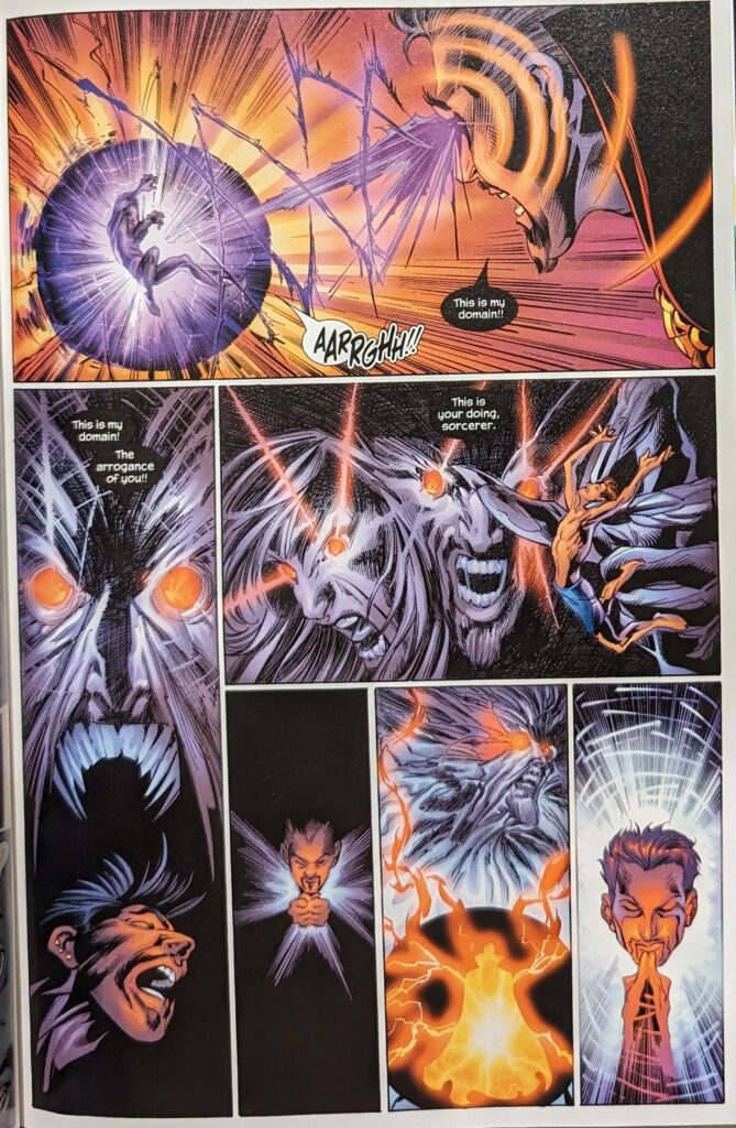 Man, this “dream coloring” is rough. I get the premise, but the execution isn’t going so well. Digital color was still in its awkward teenage phase, afterall. Well, Strange starts castin’ spells, as Nightmare, taking the forms of different people from Peter’s life in each panel, goes on and on about how this is his domain and Strange can’t hurt him here. Then, when Strange does, indeed, hurt him, Nightmare becomes his dad, briefly shocking him. But only briefly.