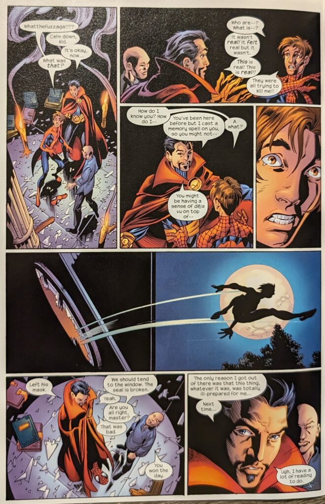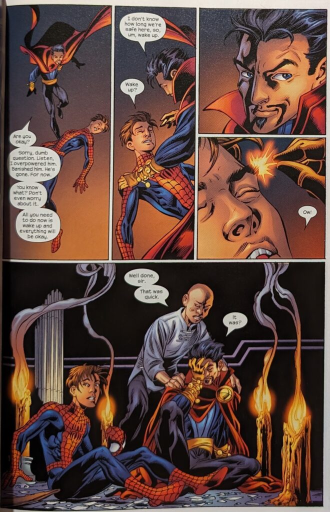 Wong looked a lot older in UMTU. He catches Strange up, confirms that the young wizard forgot to put up the proper defenses before they started meditating, and reminds him that this can allow for possession by forces outside our world. He thinks whatever had ahold of Stephen now has Spider-Man. So, Dr. Strange the Younger goes to find some books to look up how to fix this. Meanwhile, in our hero’s dreaming mind…