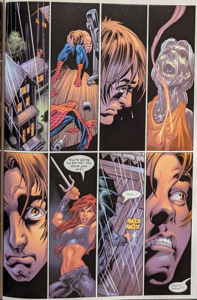 There he is. Very “Dead Marshes from LOTR” imagery. Back in the real world, Strange & Wong are searching for something to save Peter. They find writing about an ancient nightmare demon, with a known encounter where it seemed to feed on the past horrors of a famous gladiator until it killed him, to amass enough energy to gain entry to the real world. Strange says if that’s this, he has no choice but to go in after it, and Peter has to wake up. So, next page, he does, except he’s still dreaming, and Elektra is there to assassinate him. Except she’s also MJ.