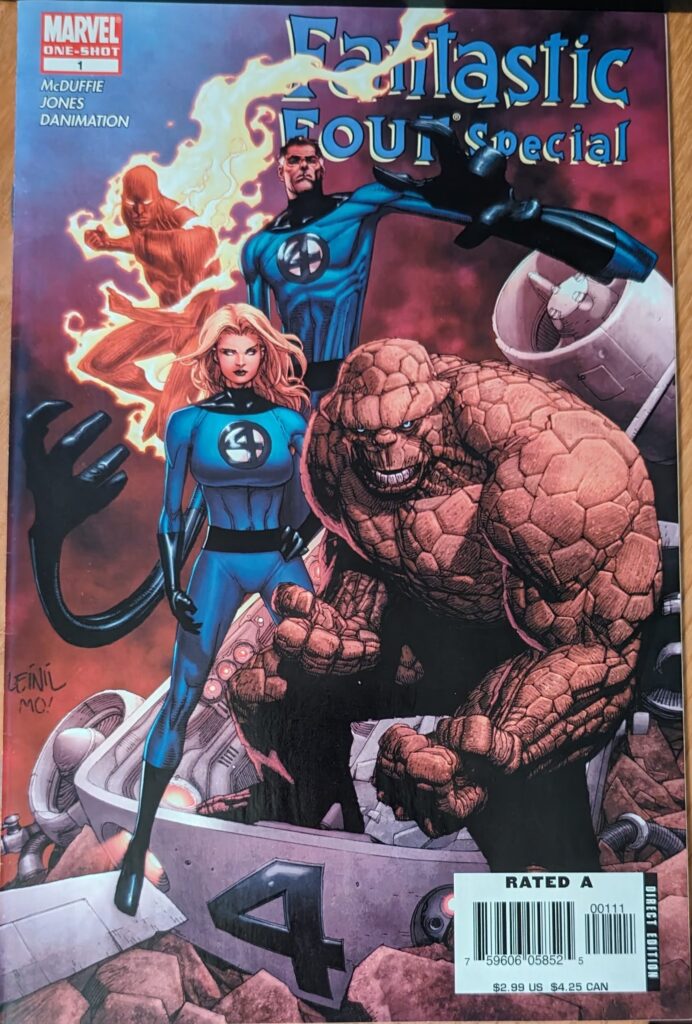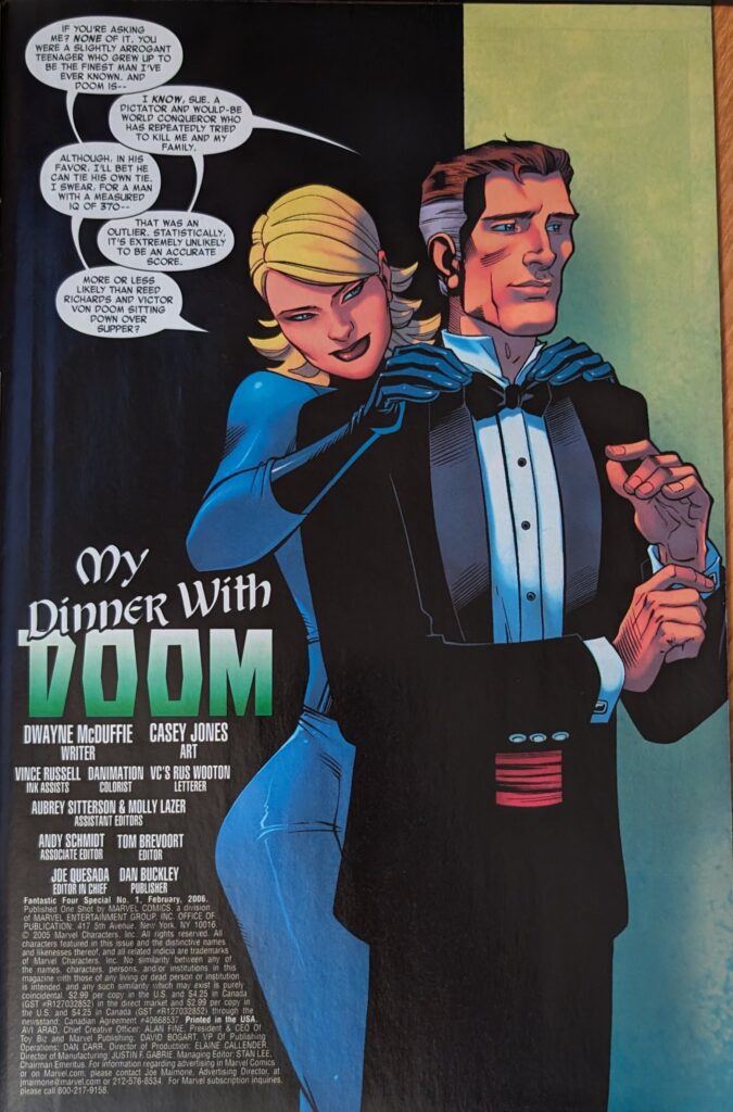 At first glance, I always think this Leinel Yu cover is Steve McNiven. Probably because of all the FF covers McNiven did around this time. It’s easy to tell their art apart, but they’re close enough that, with the right color treatment on a subject I expect from Steve, I’m thrown off for a sec. I have no idea what the deal is with this issue. It looks like the main FF book, at this time brought you to by J. Michael Strackzynski and Mike McKone, missed the month this one came out, so maybe they rushed it out to fill the shelf space. Or maybe they had it in their pocket. Whatever the reason, I find it kind of amusing, maybe bitterly, because, after writing this filler issue of FF, the great Dwayne McDuffie will be called upon to write a whole filler run on FF, when JMS does what he comes to be known for doing and bounces without warning. Mid-story, really. He will do this again on Thor. He leaves other projects in limbo for years before finishing them. He developed a rep for being untrustworthy among fans, and then quit comics for a long stretch to refocus on TV. So when JMS ghosts FF (About 7 months after this), McDuffie will write a year of FF that’s mostly just there to keep the book on the stands. A great writer, a huge talent, a mastermind behind a lot of beloved superhero cartoons, McDuffie never got the respect he deserved in comics. He wasn’t a big enough name to give FF to on a permanent basis, but they gave him a year. And it was great, I must say. I’d dropped the book when Waid & Weiringo left, but I came back for McDuffie, and PROMPTLY left again when “the real stars” took over (Mark Millar and Bryan Hitch). Anyway. McDuffie deserved better. And then he died, and everyone in comics talked about what a genius he was, despite how badly comics treated him his whole career. Typical. Well, anyway. That isn’t what this post is about. FF Special is drawn by Casey Jones, with “ink assists” from Vince Russel and colors from “Danimation.” This period where you couldn’t get just a person’s name in the colorist box is so weird. This special begins with Reed recapping his history with Dr. Doom when they were in college, wondering how much of what happened was his fault. Because this comic’s called…