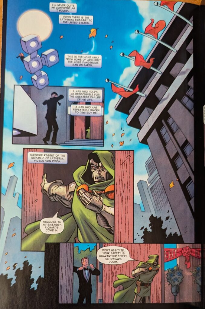 Doom has seemingly appeared at all 3 locations, the 3rd of course being the Baxter Building, and the other FF members leap into action at each of them.