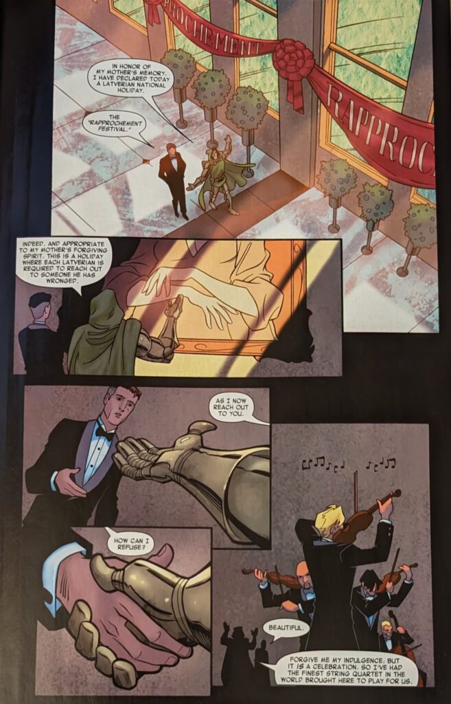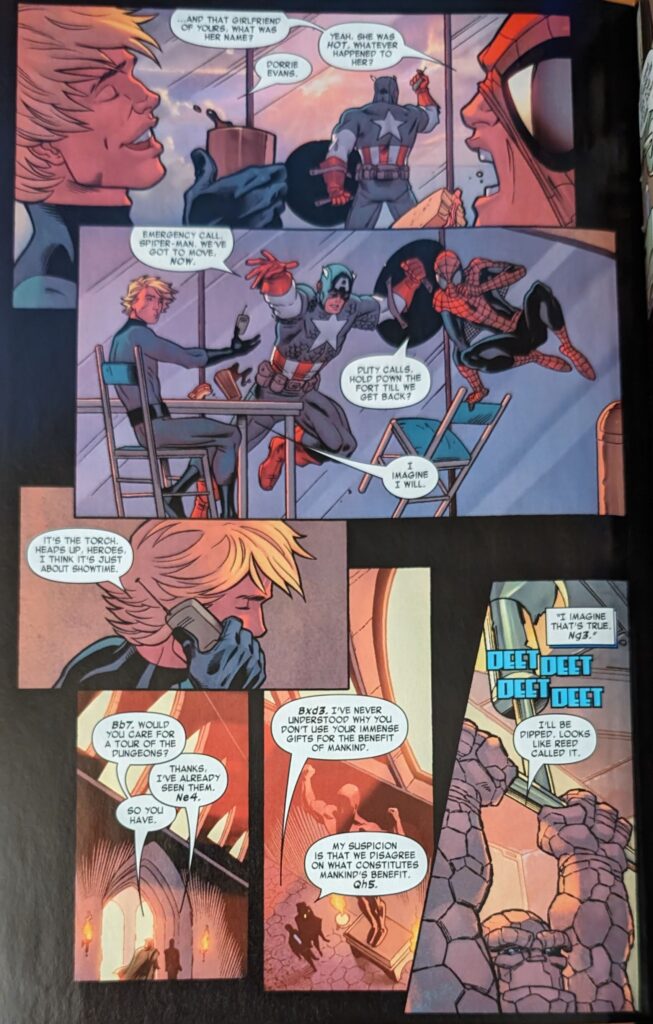 This page isn’t his only appearance, but from there we go see Sue at the offices of Damage Control, a concept that McDuffie originated and wrote across 3 miniseries in the late 80s (And, perhaps unbeknownst to him in 2005, one more a couple years hence). Meanwhile, in Latveria, Doom explains that surely a Latverian holiday should be celebrated there, before picking up the chess game he & Reed were playing in college when Doom blew up. And so, they do that awhile, but just telling each other the moves, from memory, all these years later. Supergeniuses and all. A fun gimmick!