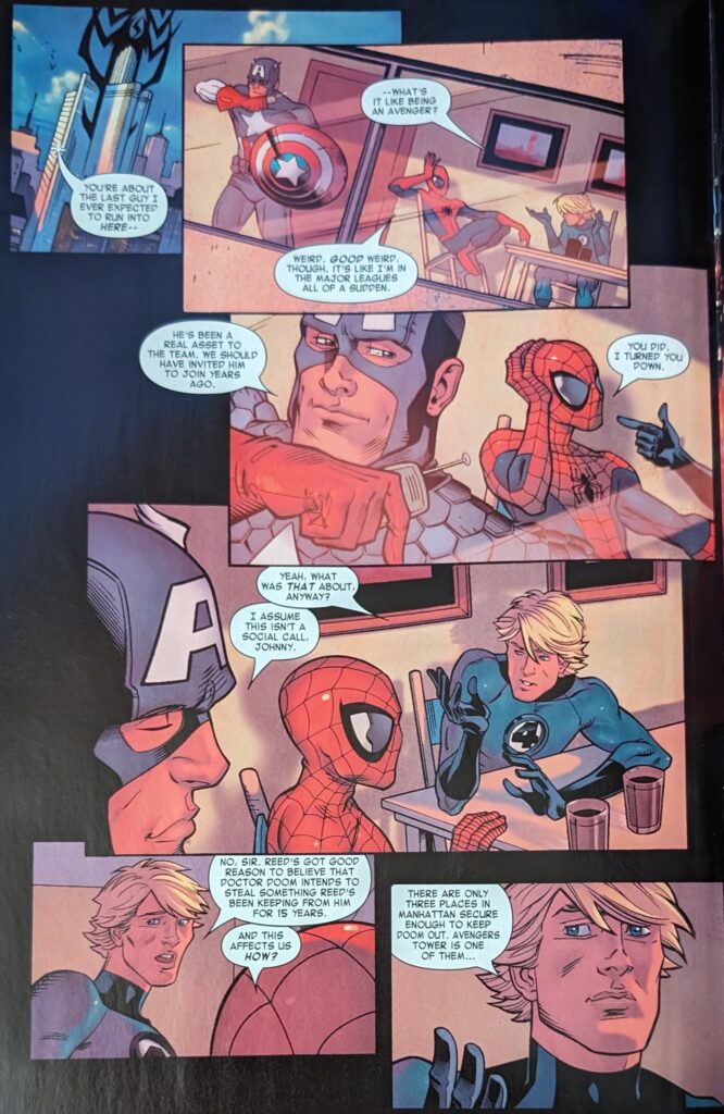 Jones is so aggressively and intentionally drawing John Byrne’s Dr. Doom mask throughout this issue, it’s really weird. Well, anyway, Doom presents various niceties and continued assurances that it’s all good, even as they pass through a door that teleports them to Castle Doom. Whoops! But, hey, remember how this is a Spider-Man blog?