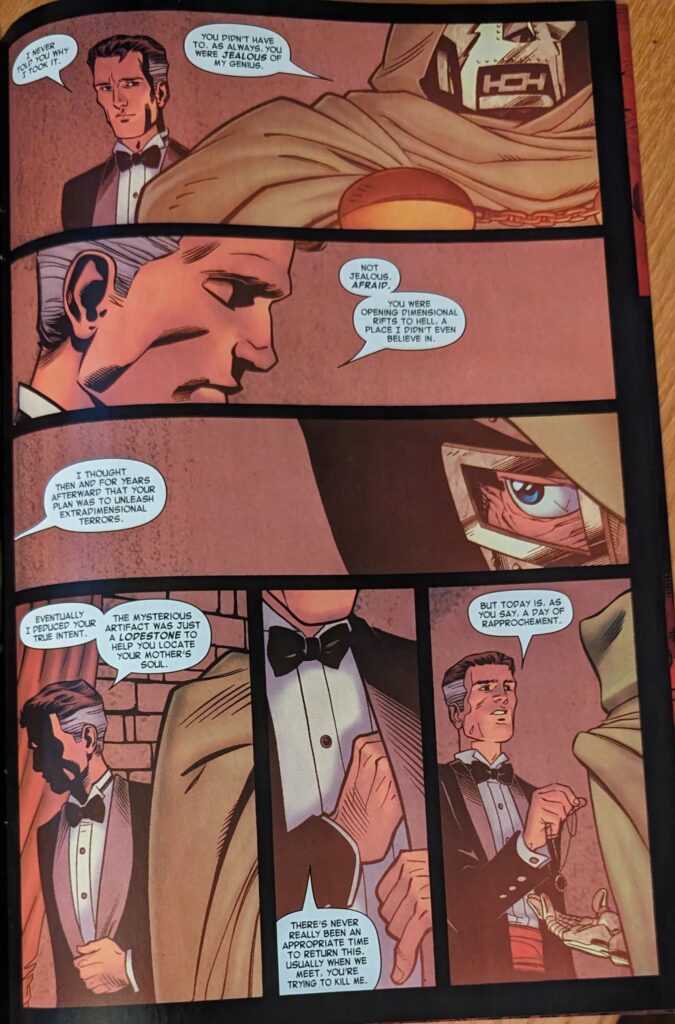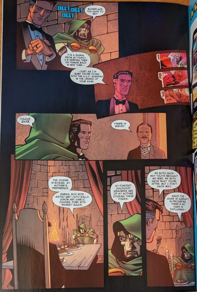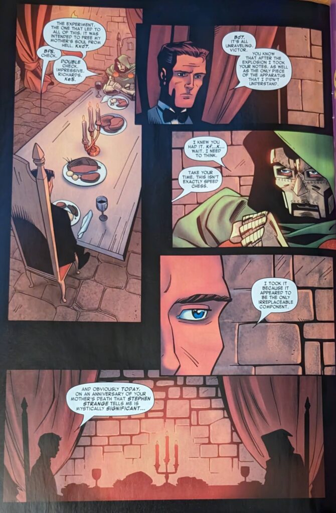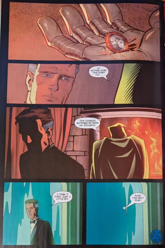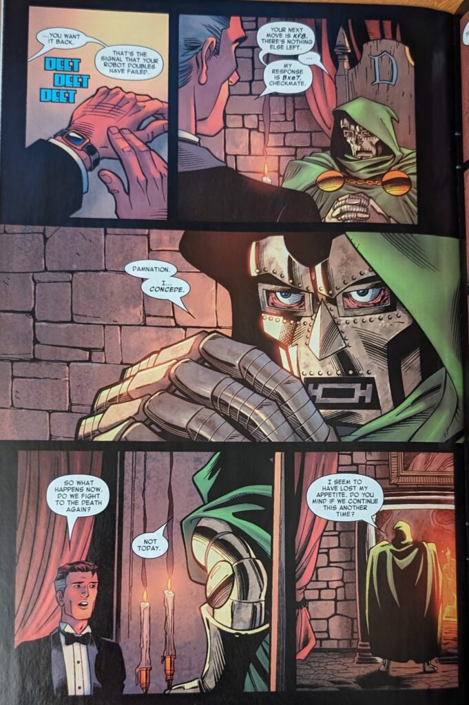 We see Sue, Johnny and Ben all defeating their Doombots (Obviously), as Reed and Doom make it to dinner…