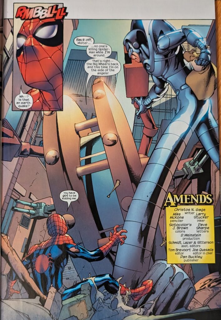 Salvador Larocca really jocking the posters for the Spider-Man movies. That’s right, this post will also cover (some of) a random Fantastic Four special. I don’t really get why this book even exists, but our boy’s in it. First, tho, SMU which, as always, features 2 short stories. First up. Writer Christos Gage, penciler Mike McKone, inker Larry Stucker and colorist “Sotocolor’s J. Brown” (Not getting a really credit because you joined one of these coloring or lettering houses is lame).