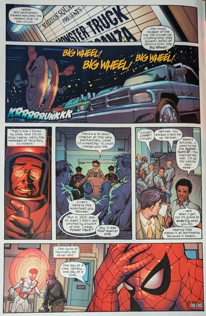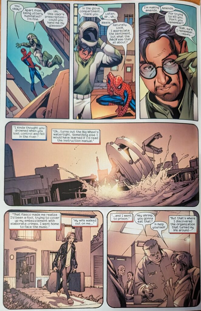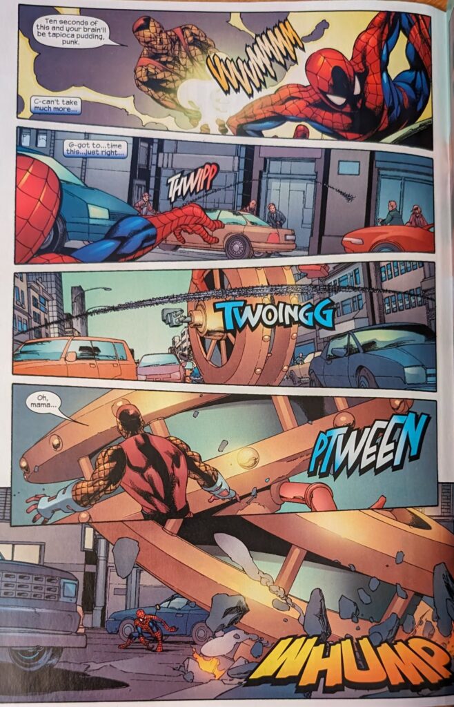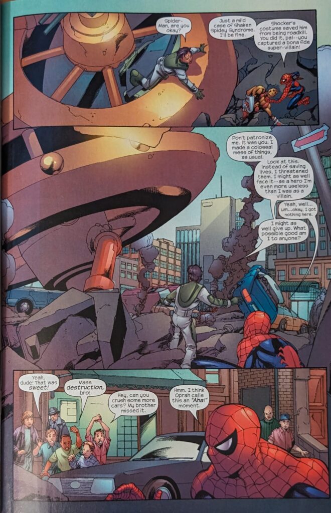 So, our big hearted hero goes looking for a thing he thinks Big Wheel can handle, runs into a bank robbery, thinks it’s all good, but then Shocker turns out to be part of it. Big Wheel is sent rolling out of control, Spider-Man is shocked a few times, and he makes a Wayne’s World reference in 2005. Going good.